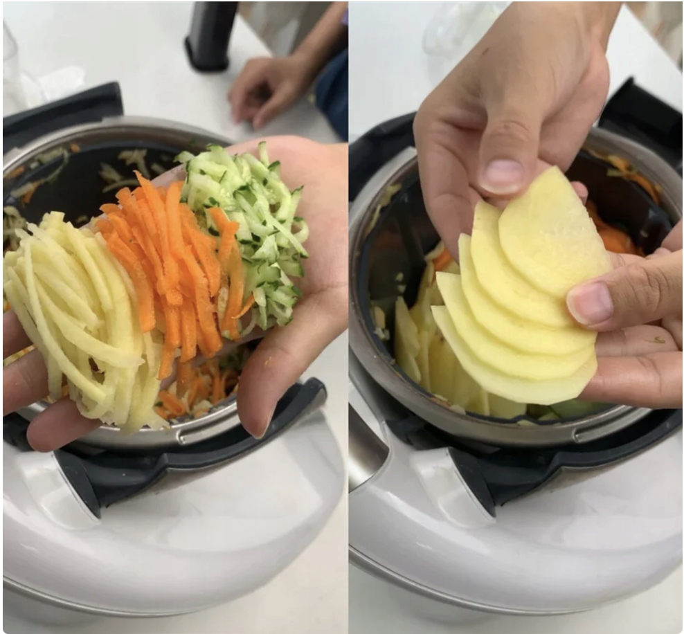 6) Поместим выбранную овощ в отверстие для крышки и нажимайте с помощью толкателя.