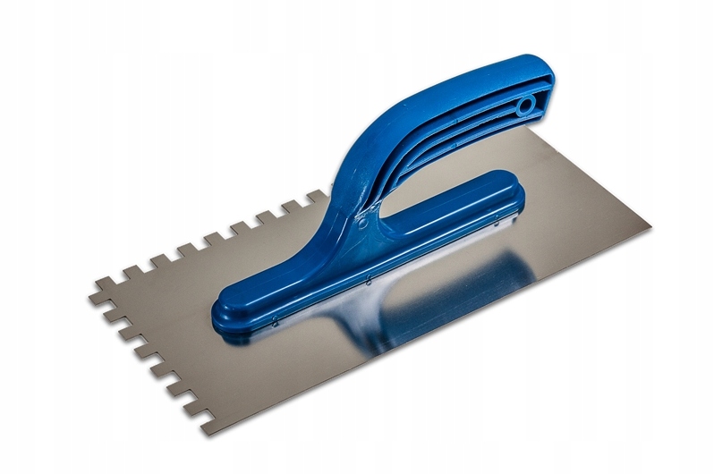 Кельма зубчатая из нержавеющей стали изготовлена из нержавеющей стали с добавлением 1% никеля. Имеет столешницу с двумя гладкими и двумя зубчатыми краями (зубцы прямоугольные) и пластиковую ручку. Кельмы этого типа применяются при укладке плитки – в первую очередь при нанесении на плитку клеев и растворов; их также можно использовать для создания декоративных узоров.