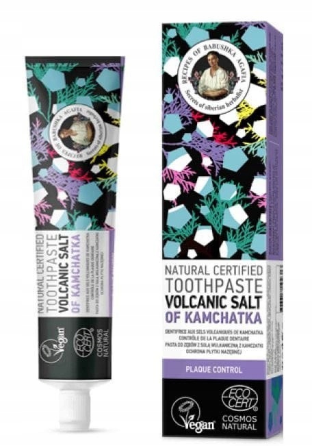 Евробио Лаборатория – восточноевропейский производитель косметики на основе натуральных и органических ингредиентов. Рецепты Бабушки Агафьи — это линия косметики на основе тщательно отобранных сибирских трав. Паста обогащена вулканическим пеплом, который насыщает десны микроэлементами и обеспечивает естественную белизну зубов. Морская соль эффективно очищает зубы, а активированный уголь уменьшает образование зубного налета. Паста не содержит фтора. Зубная паста «Вулканическая соль Камчатки» Plaque Control имеет следующие сертификаты: Ecocert Cosmos Natural и Vegan. Сертификат ECOCERT означает, что продукт не содержит синтетических ароматизаторов и красителей, силиконов, парафина и других ингредиентов нефтяного происхождения. COSMOS Natural означает, что продукт содержит не менее 95% ингредиентов натурального происхождения. Продукт имеет маркировку Vegan, присвоенную Vegan Society, что означает, что продукт не содержит ингредиентов животного происхождения, даже молока или меда. Кроме того, продукт и его ингредиенты не тестировались на животных.