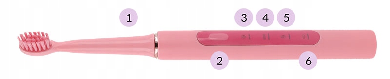 Конструкция: 1. Голова 2. Кнопка ВКЛ/ВЫКЛ 3. Режим брызг 4. Режим плавности 5. Режим пузырьков 6. Индикатор зарядки аккумулятора