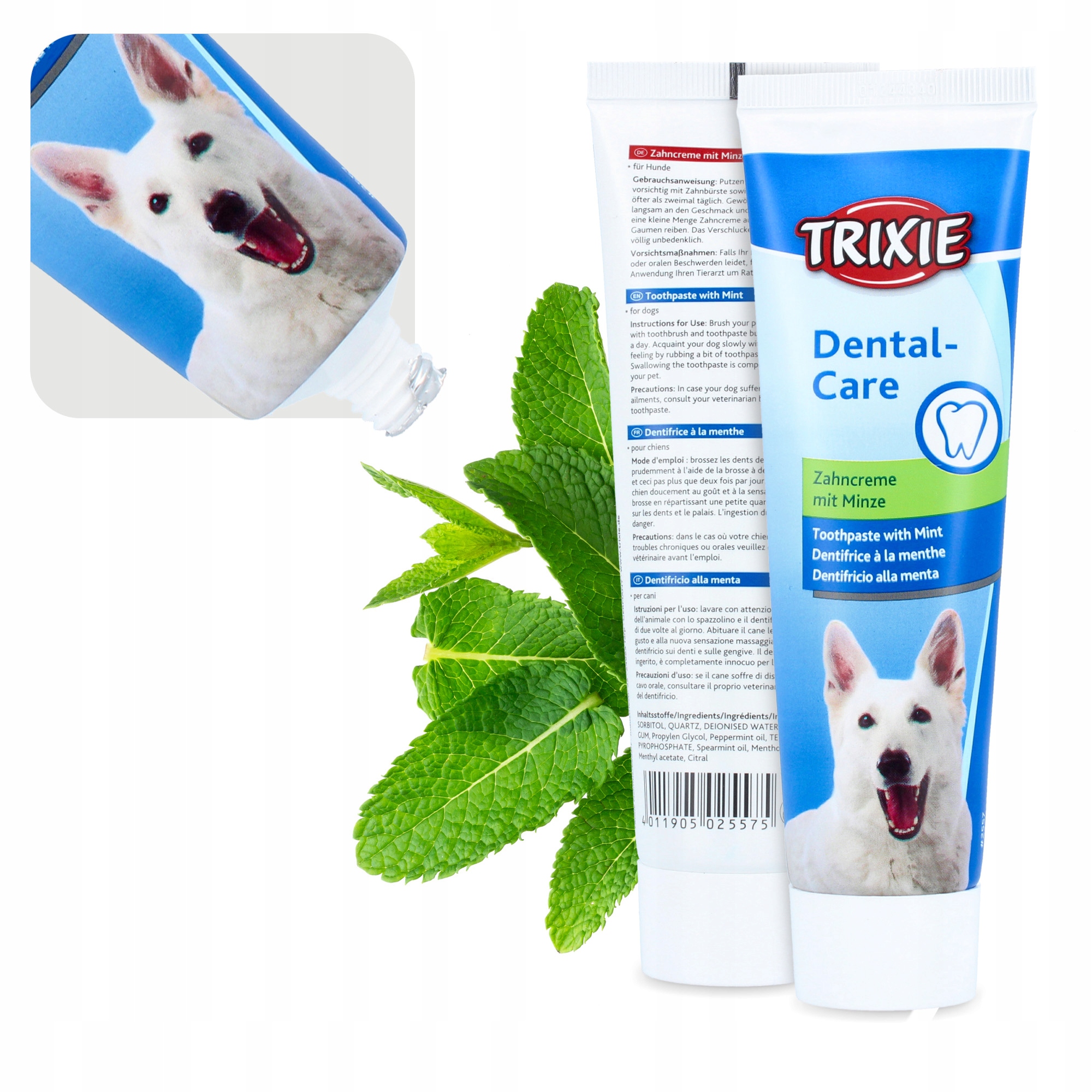 Зубная паста с приятным вкусом побуждает собаку чистить зубы. Дополнительный спрей питает зубы, освежает дыхание и уменьшает образование налета и зубного камня.