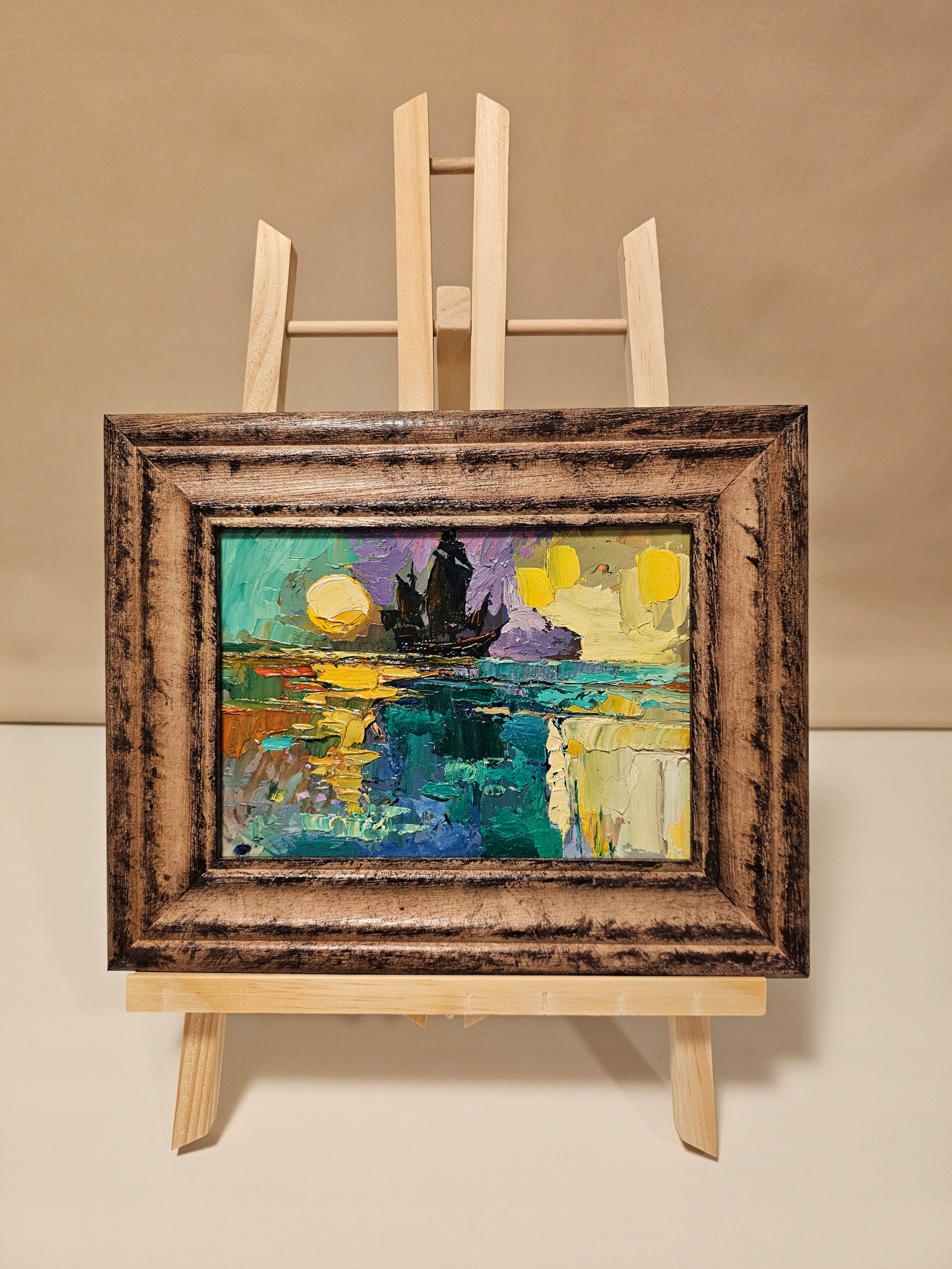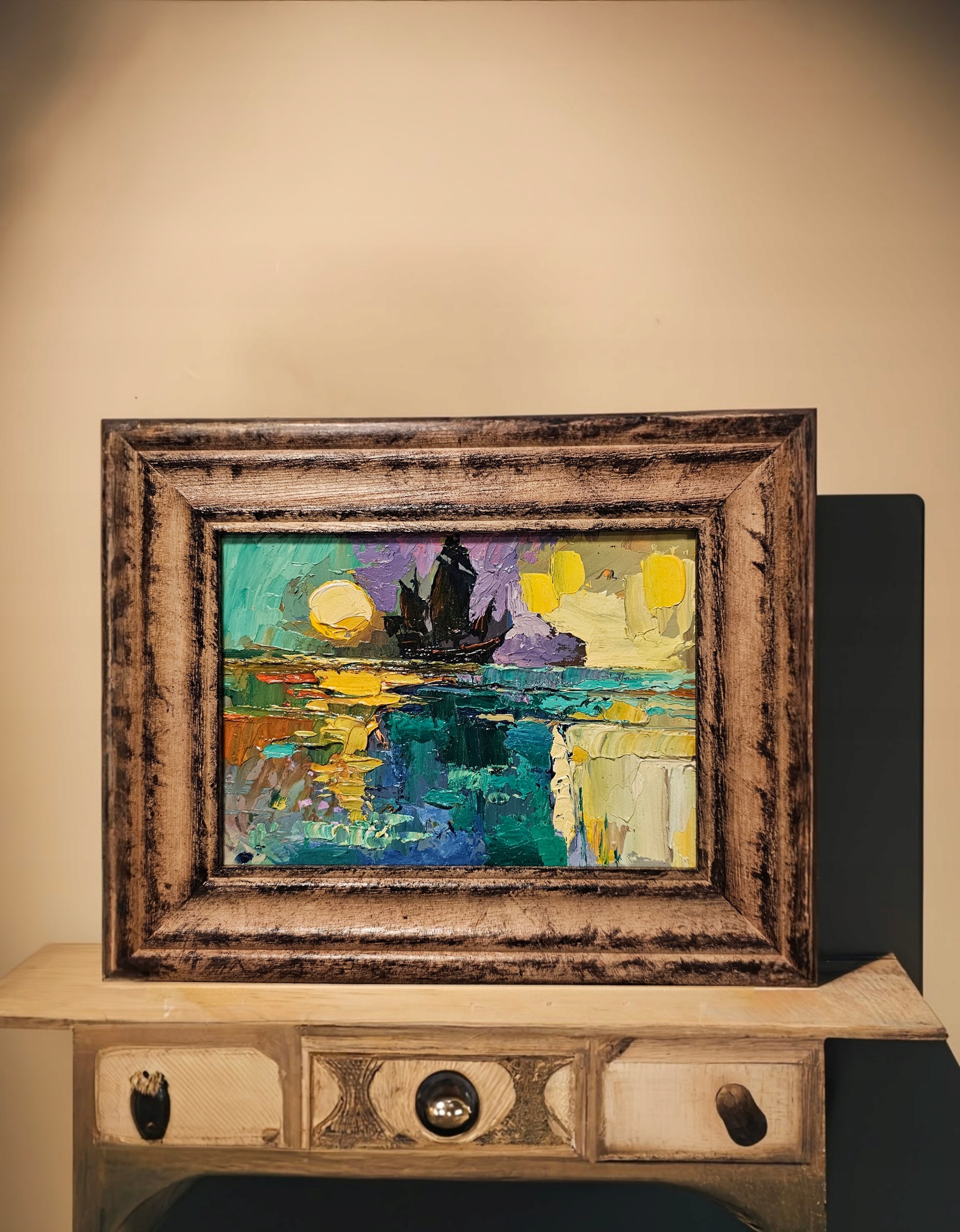 На картине «Встреча» изображен момент, когда парусник отправляется навстречу новым мирам. Величественный корабль гордо рассекает волны, направляясь к далеким горизонтам и неизведанным берегам. Яркие и насыщенные оттенки зеленого, желтого, синего и фиолетового переплетаются, создавая ощущение приключений и открытий. Парусник символизирует стремление к новым горизонтам, жажду знаний и освоения неизведанного, наполняя дом атмосферой возможностей, мечты и свободы.