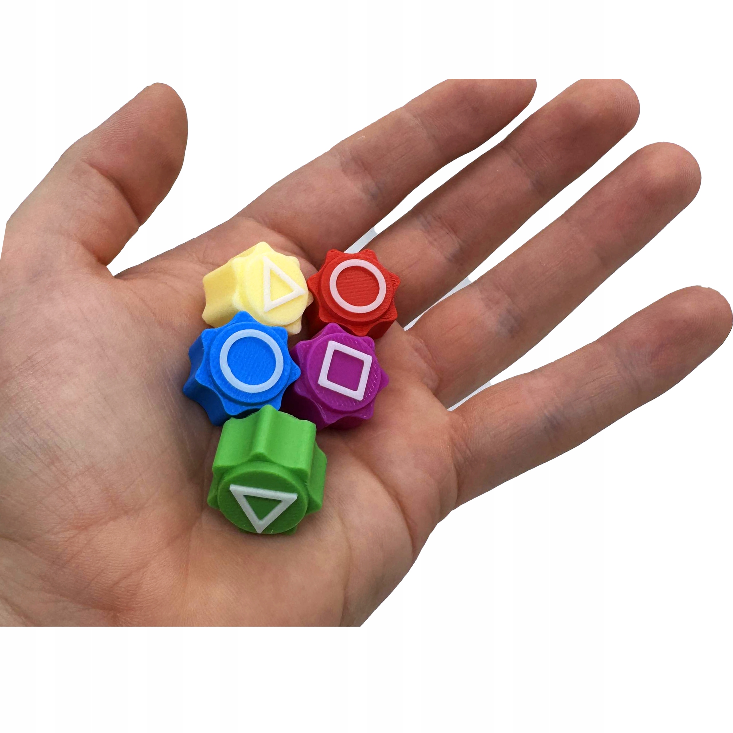 ✅ Набор из 5 красочных утяжеленных кубиков, украшенных символами, отсылающими к игре «Кальмары» — уникальный дизайн, отличающий эту игру.