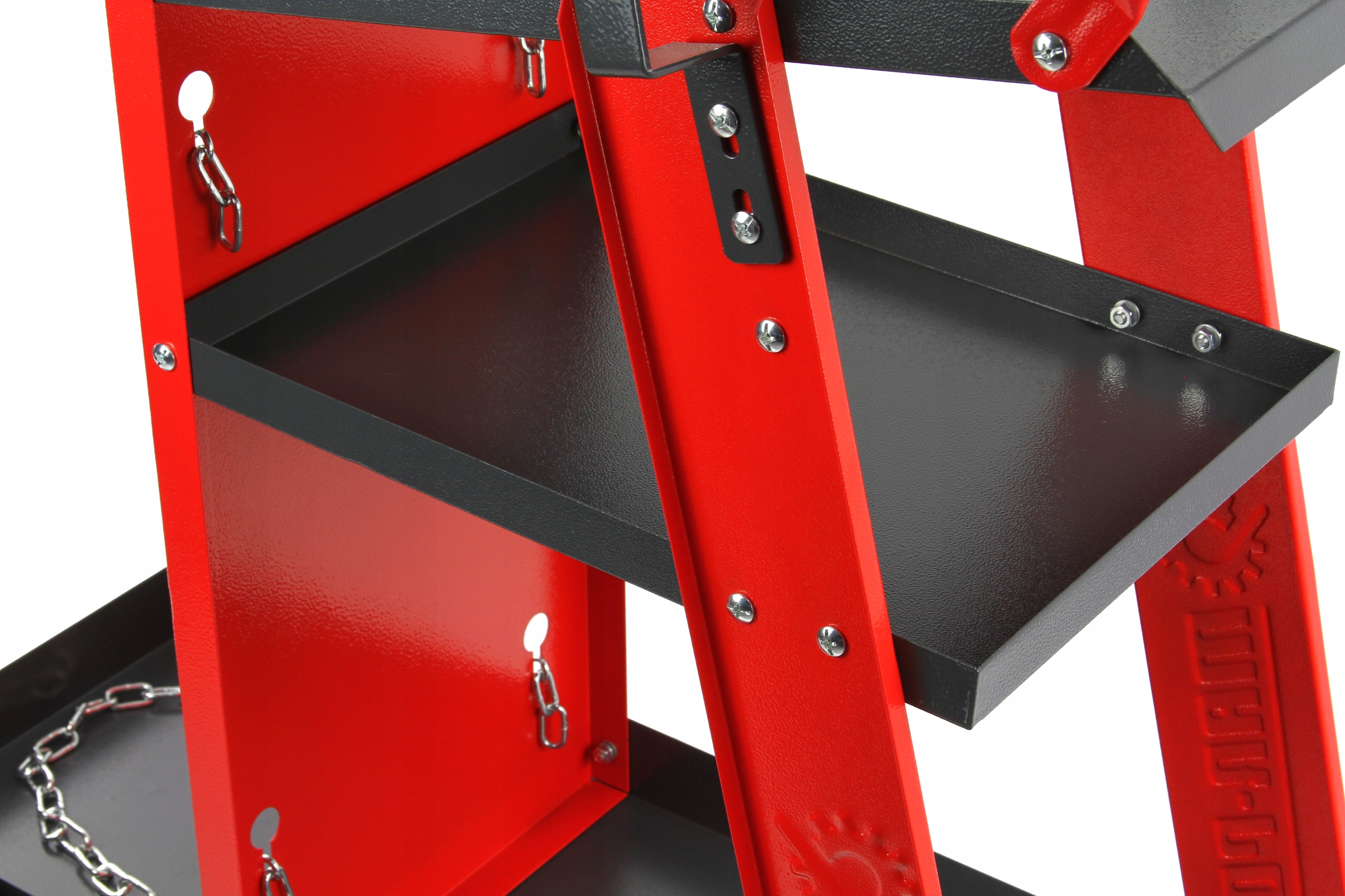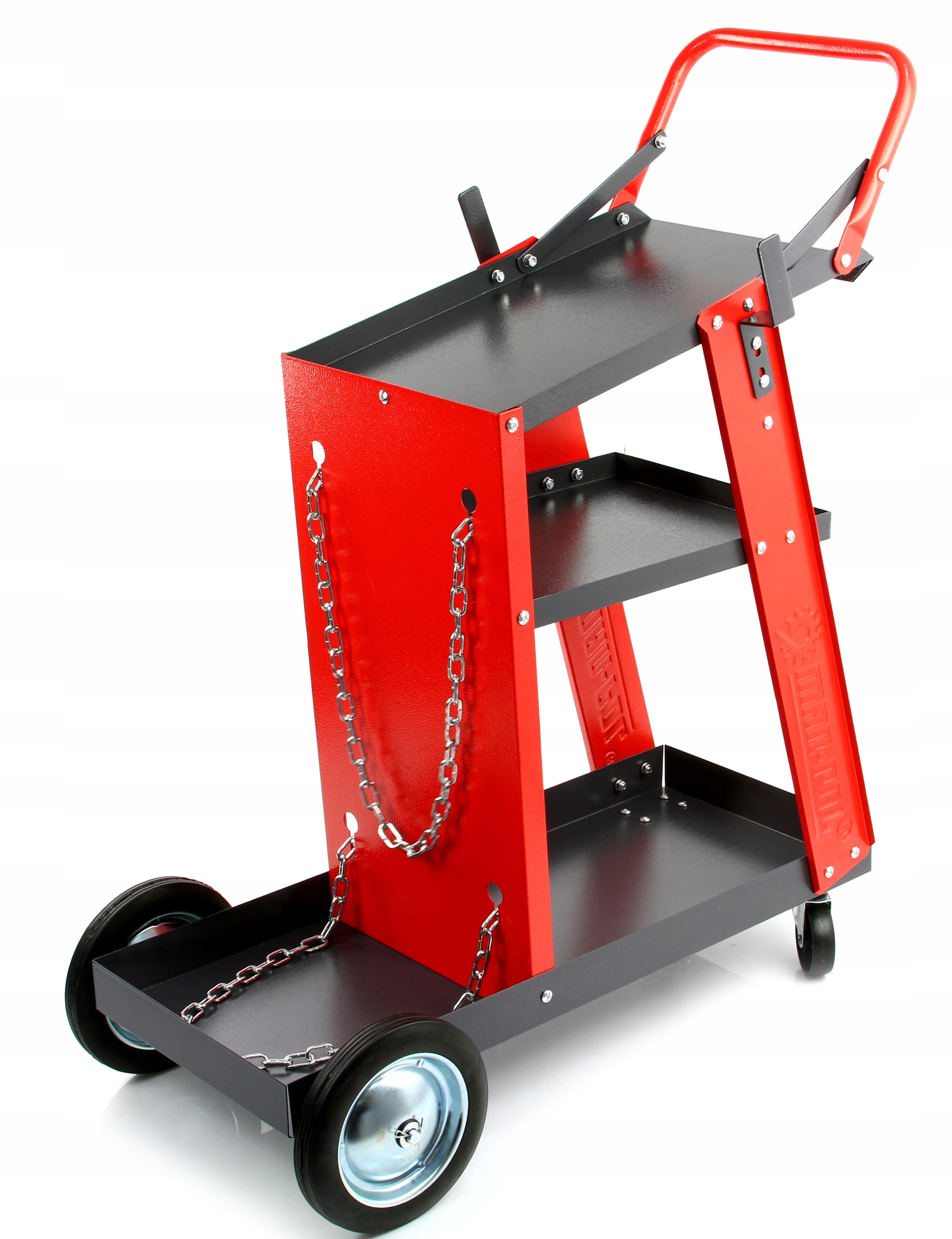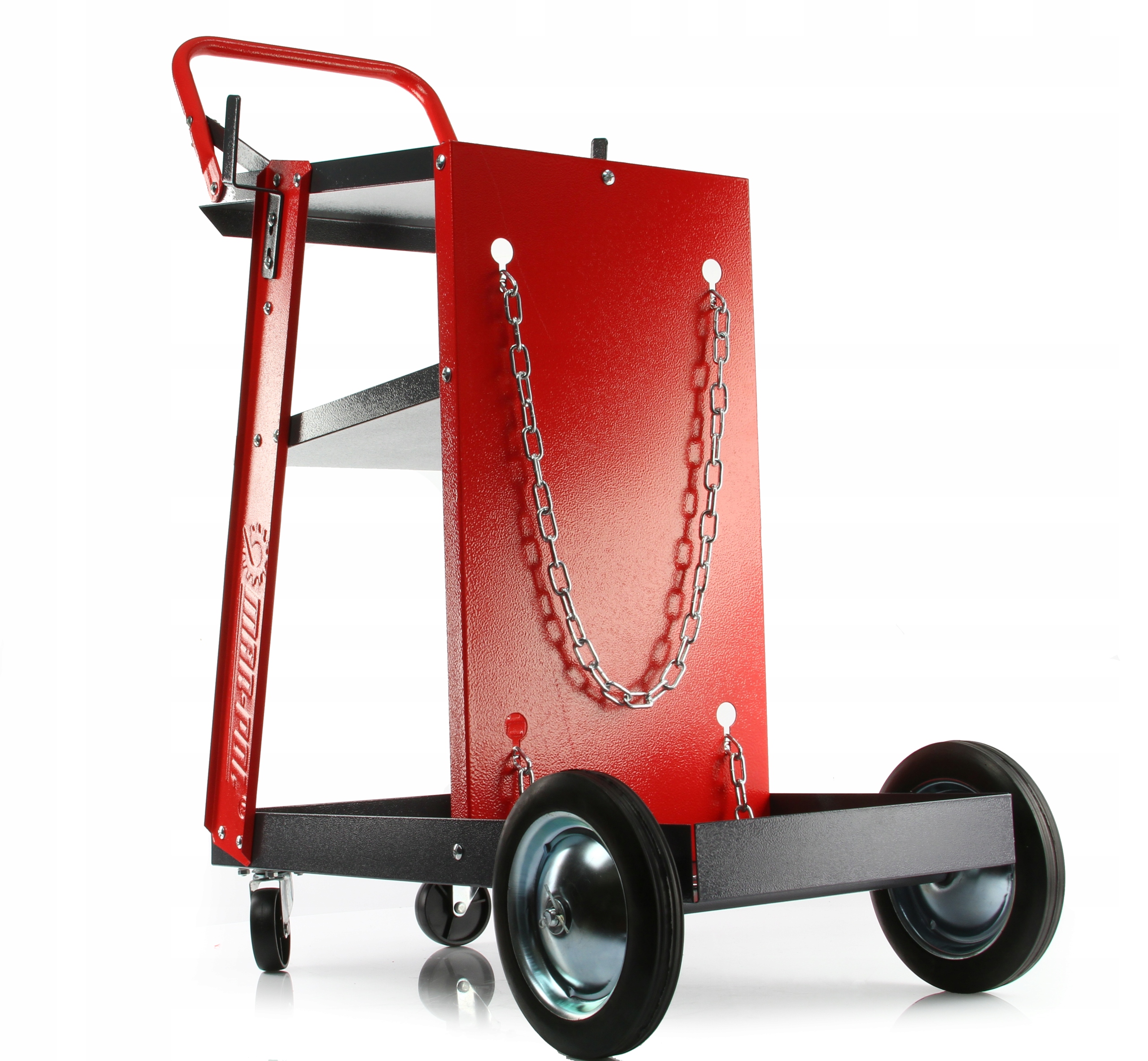 ► Верхняя полка предназначена для сварочного аппарата, две другие имеют большую емкость для принадлежностей. В задней части коляски имеется полка для баллонов с двумя цепями для их стабилизации