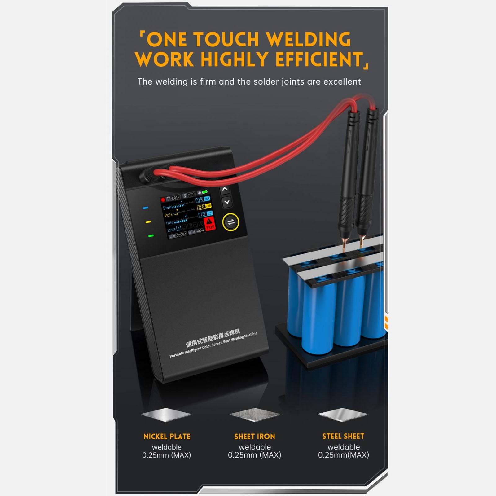 1. Сварная толщина от 0,1 до 0,25 мм, максимальный сварки тока 1200A, 4 регулировки передачи.