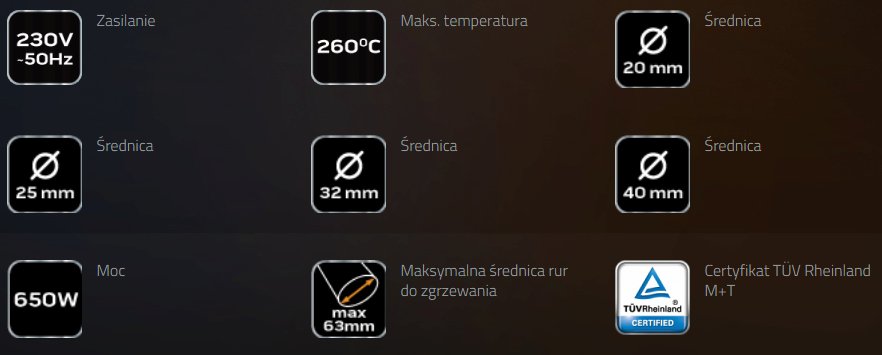 Пластиковый сварщик труб, как PE, PP и PB. Его мощность составляет 650 Вт и приводится в движение напряжением 230 В - 50 Гц. Максимальная температура сварочной машины составляет 260 ° C. Устройство продается вместе с четырьмя нагревательными рукавами. Они используются для сварки придурок, фитингов и труб с максимальным диаметром 40 мм. Каждый рукав покрыт покрытием PTFE, которое продлевает срок их обслуживания и допускает экономическую работу. Качество сварочной машины и ее элементов подтверждаются выпущенными сертификатами CE и Tüv Rheinland. Tüv свидетельствует о высоком качестве, прочности и безопасности устройства. Для удобства транспортировки и хранения был создан специальный чемодан с твердым пластиком, в котором его можно хранить.