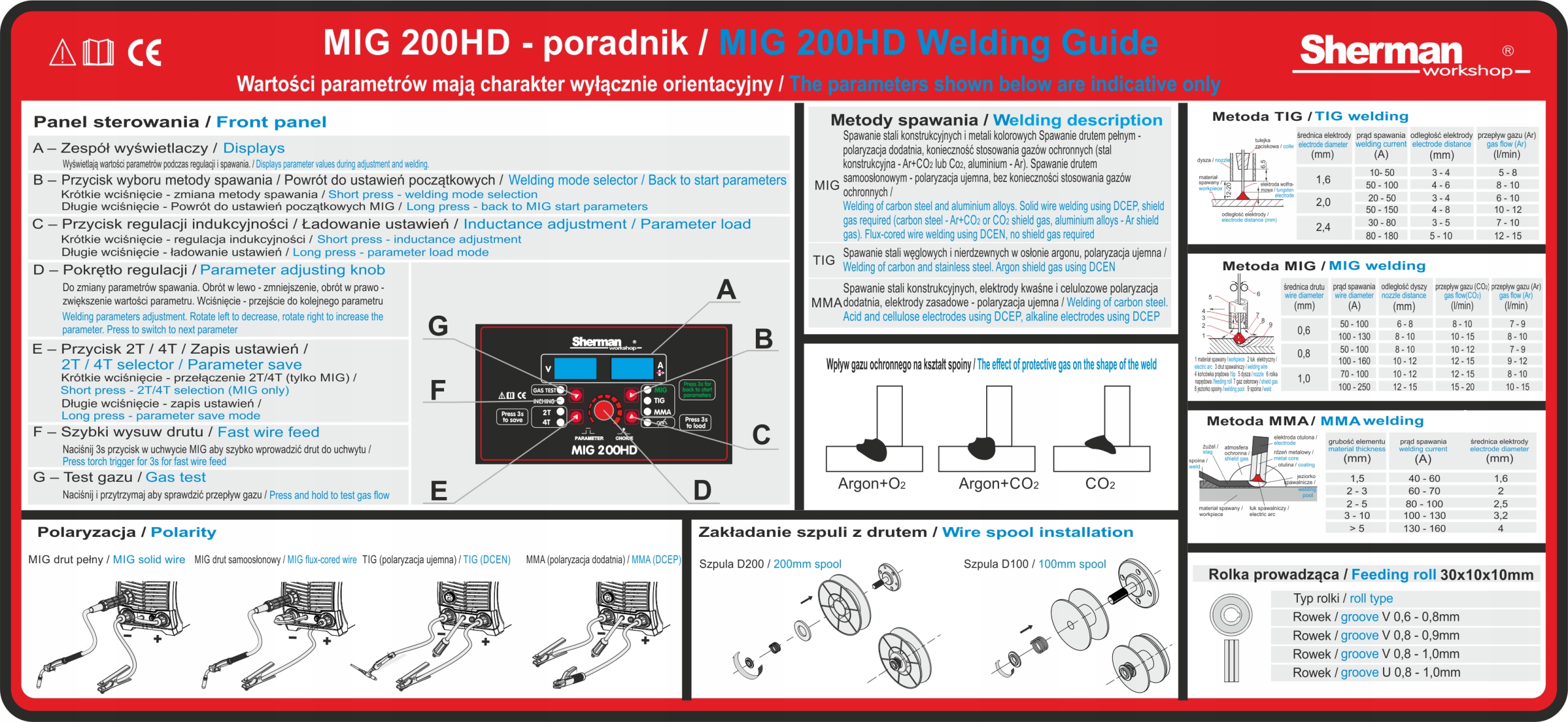 - Сварочный ток [А]: MIG: 200; мма: 180; TIG: 180