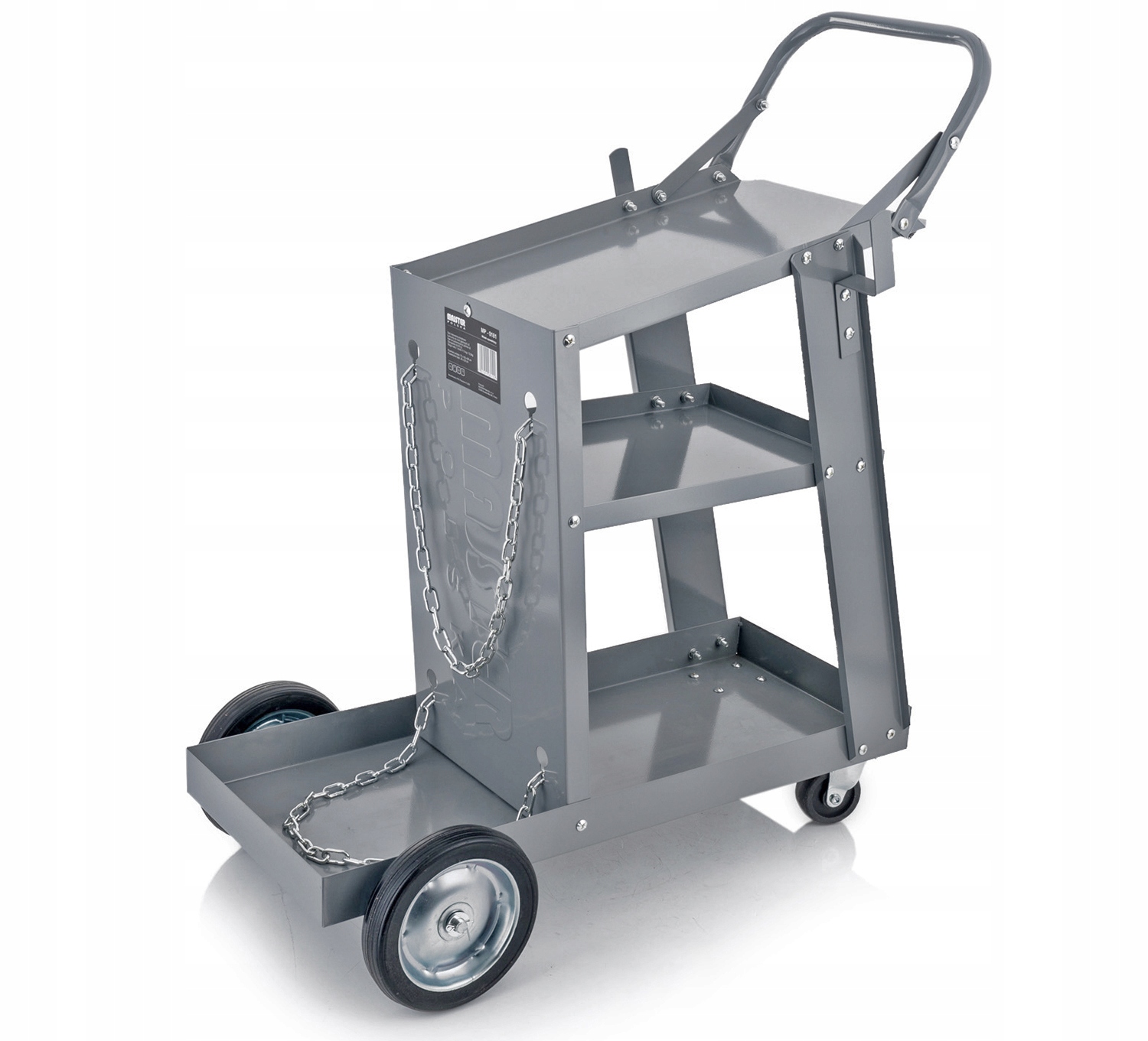 ► Верхняя полка предназначена для сварочного аппарата, две другие имеют большую емкость для принадлежностей. В задней части коляски имеется полка для баллоновс двумя цепями для их стабилизации