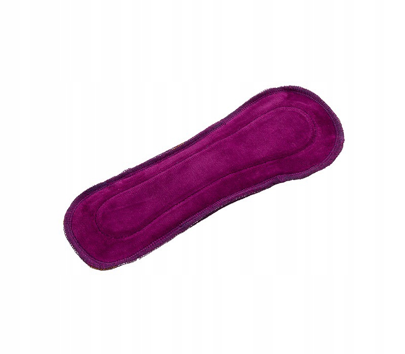 Со стороны тела гигиеническая прокладка покрыта слоем хлопкового бархата фиолетового цвета. Со стороны нижнего белья это трикотаж с красивым принтом (100% хлопок). Внутренняя часть состоит из внутреннего водонепроницаемого слоя PUL, предотвращающего протекание, и двух сильно впитывающих вставок из хлопкового бархата. .