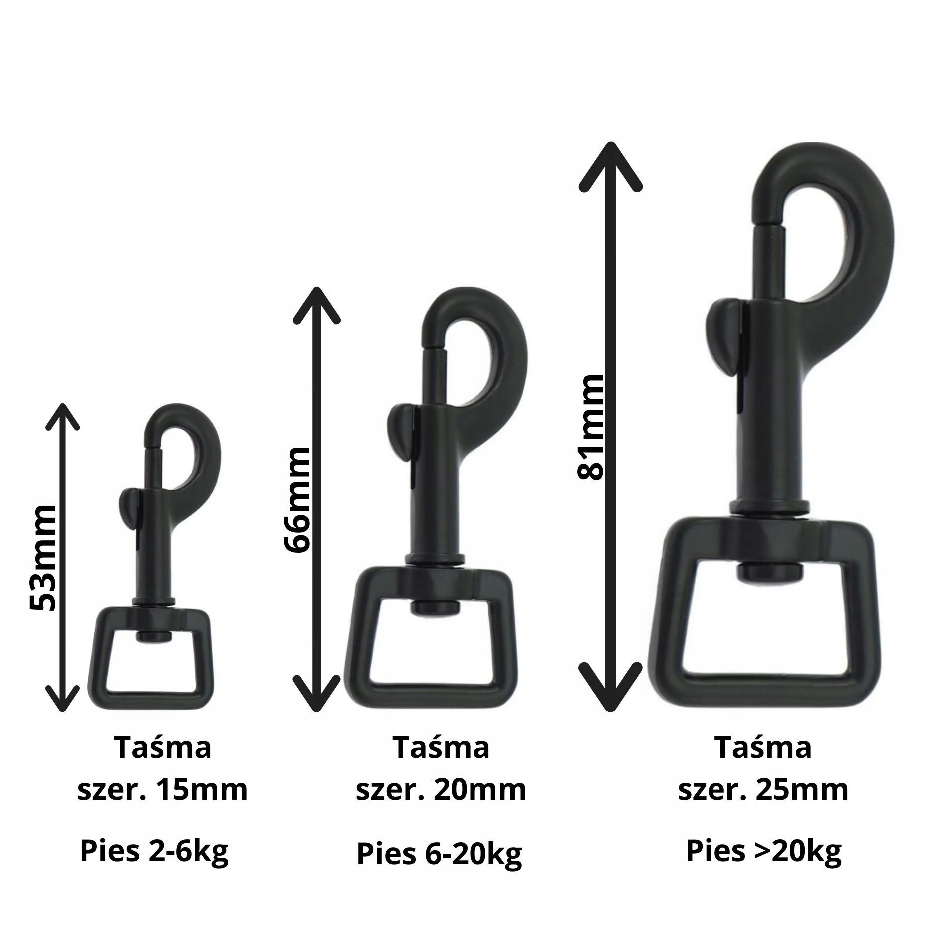 - Ширина: 15 мм, карабинер: 53 мм: для очень маленьких собак 2-6 кг , которые не требуют большой силы для контроля.