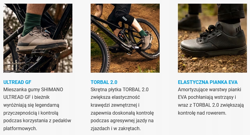 - Резиновая смесь SHIMANO ULTREAD GF и протектор обеспечивают легендарное сцепление и контроль при использовании педалей платформы.