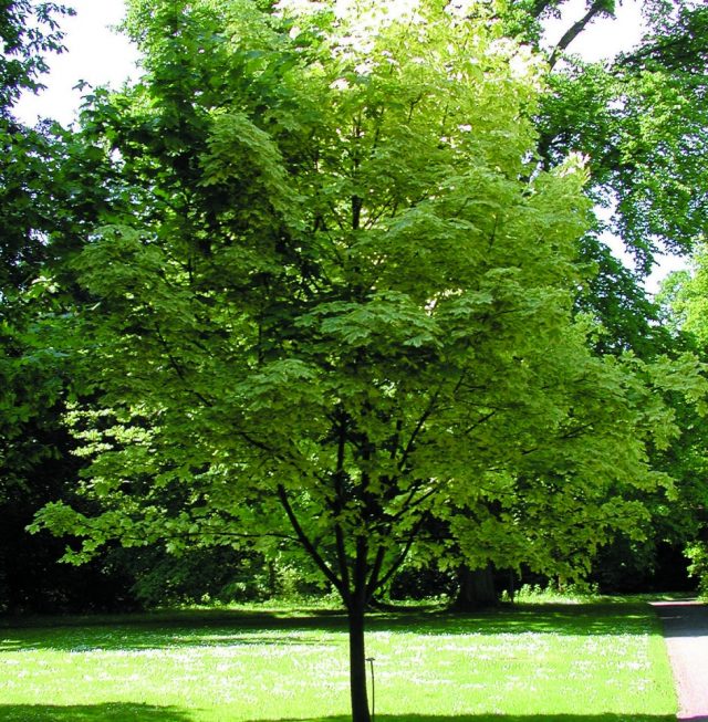 Благодаря своей окраске этот клен отлично смотрится на темно-зеленом фоне других растений.