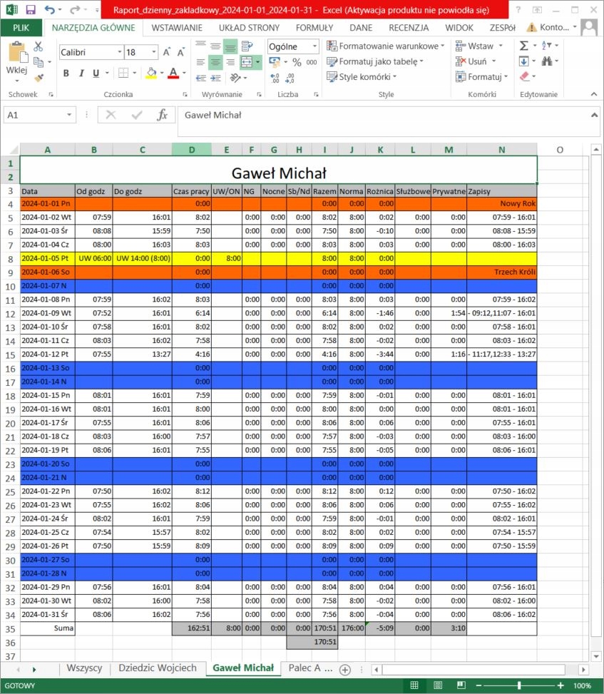 - Автоматический расчет количества дней, работающих в данные даты (период может быть выбран), а затем на основе количества рабочих дней, L4 и листьев рассчитываются в нормах, и после сравнения рабочее время рассчитывается количество сверхурочных (с знаком плюс) или нехватка рабочего времени (с минусным подписью). time at night and specifies it in a separate column