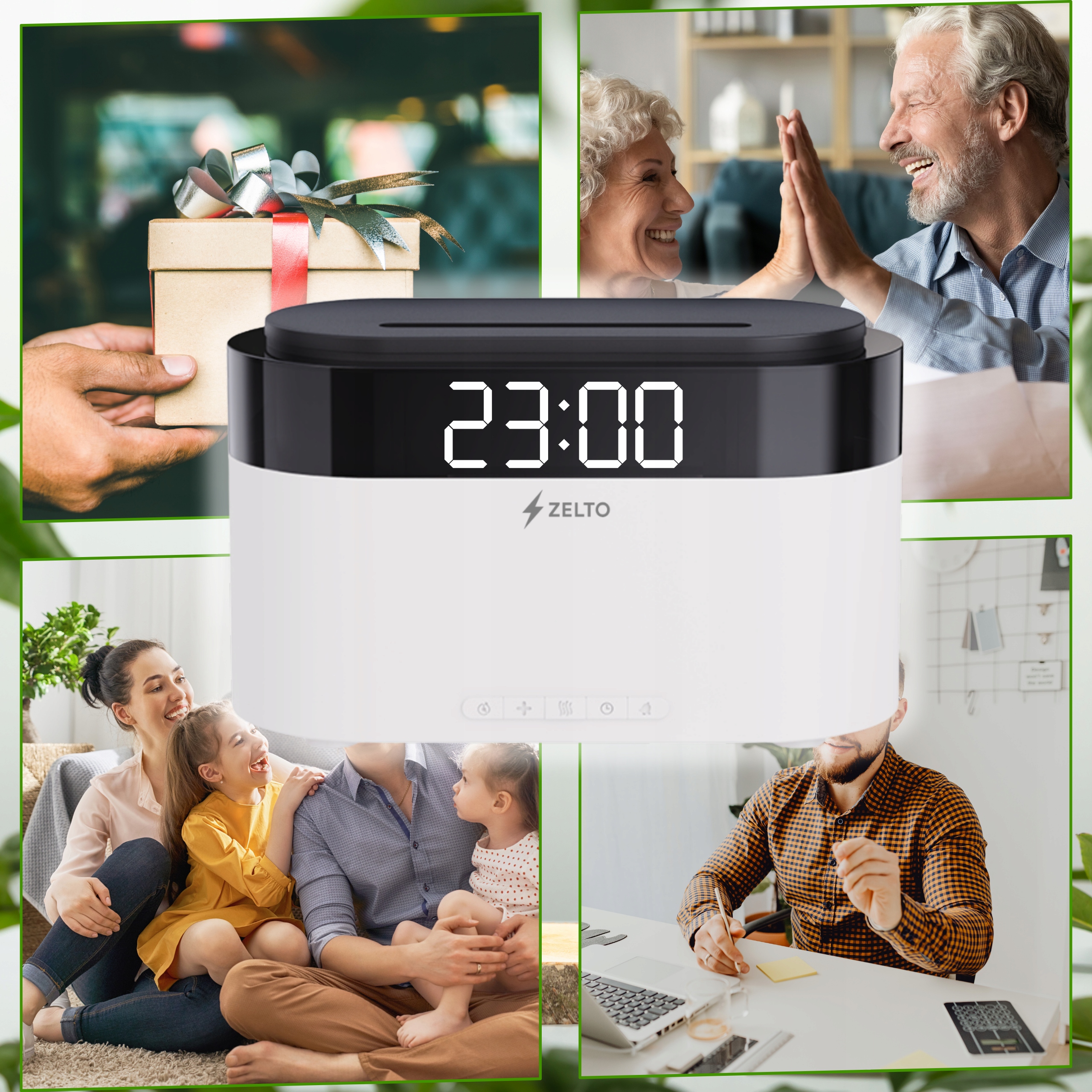 - Функции 4-в-1: Диффузор, Увлажнитель, Светодиодные часы, Будильник, Ночник