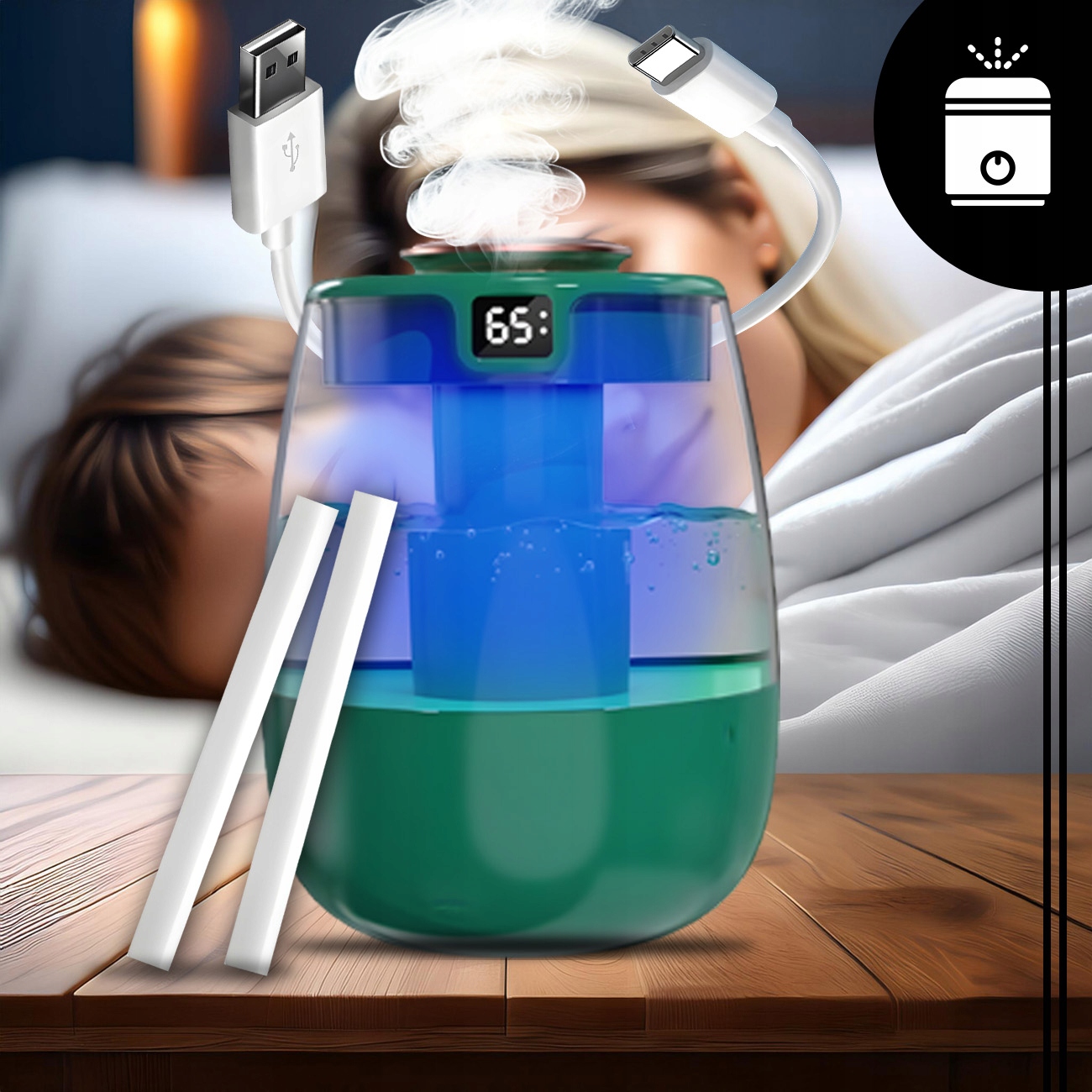 Благодаря ультразвуку устройство генерирует деликатный туман, который эффективно увлажняет воздух, что особенно полезно для людей, страдающих респираторными заболеваниями.