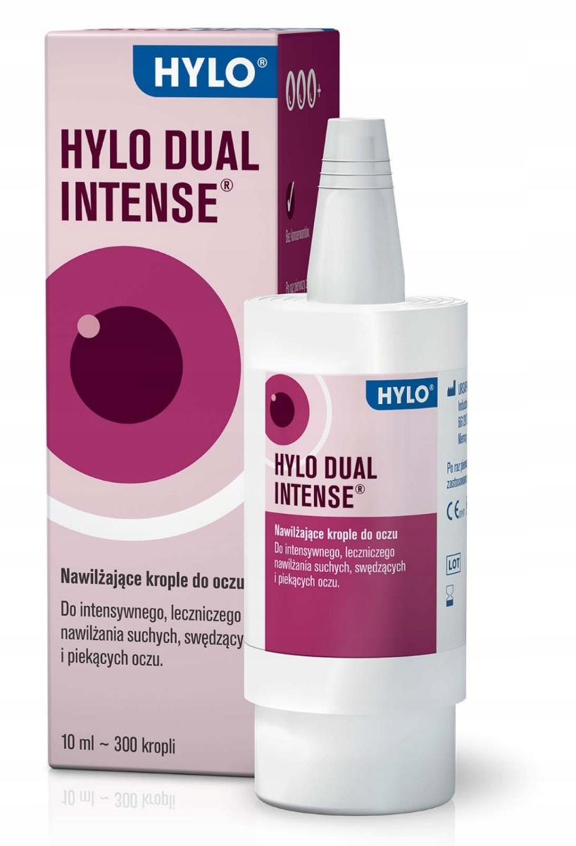 Hylo-Dual Intense предназначен для интенсивного лечения и увлажнения сухих глаз, в том числе: при синдроме сухого глаза. Увлажняющие капли для глаз Hylo-Dual Intense: сильно увлажняют благодаря сочетанию гиалуроновой кислоты 0,2% и эктоина 2%, обеспечивают длительное увлажнение поверхности глаз, стабилизируют слезную пленку, создают защитный барьер от раздражающих факторов, не содержат консерванты или фосфаты обеспечивают точное нанесение благодаря системе Comod – благодаря этому они служат дольше. Как действуют ингредиенты Hylo-Dual Intense? Гиалуронат натрия – вещество с сильными гигроскопическими свойствами – одна молекула связывает до 250 молекул воды. Натриевая соль гиалуроновой кислоты создает на поверхности глаз устойчивую, трудно смываемую пленку, которая сильно увлажняет и защищает от пересыхания. Эктоин увеличивает способность поверхностных структур глаза связывать воду. Стабилизирует липидный слой слезной пленки, защищая слезу от испарения и высыхания. Эктоин успокаивает раздражение поверхности глаза. Комбинация увлажняющих и успокаивающих веществ обеспечивает сильно регенерирующую терапию для глаз. Капли устраняют зуд и защищают от дальнейшего раздражения.