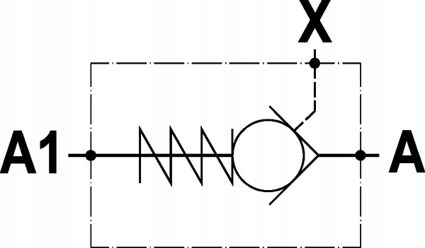 Техническая информация:Обратный клапан от А к А1. Закройте порт A1, порт для пилотного клапана X. Клапан следует устанавливать как можно ближе к цилиндру. Подключите распределитель к А и цилиндр к А1.