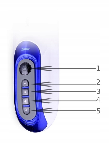- #1 Кнопка включения/выключения. Нажмите и удерживайте в течение 2 секунд, чтобы включить устройство. После активации короткое нажатие этой кнопки приостанавливает действие толчка. Чтобы выключить устройство, снова нажмите и удерживайте кнопку в течение 2 секунд.