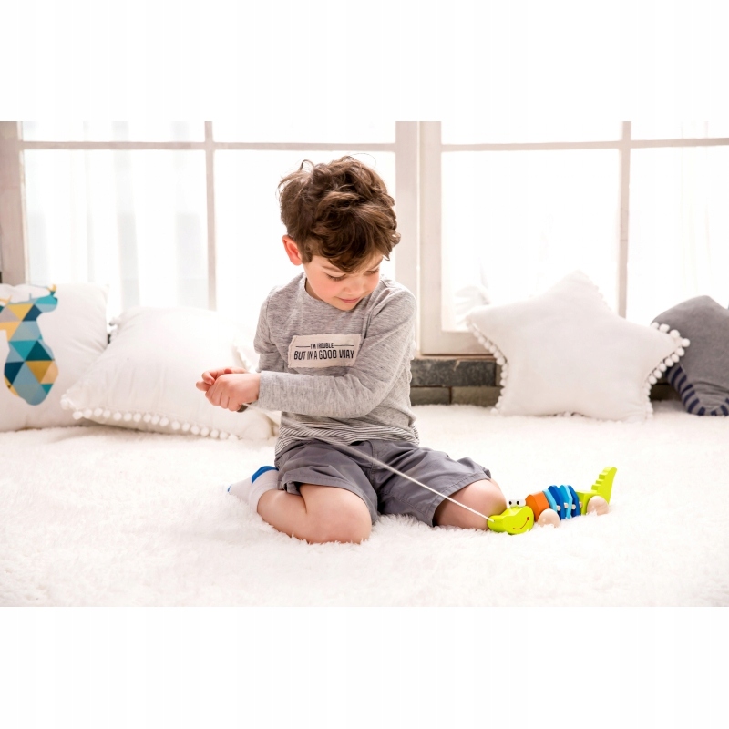 - Крокодил Classic World — великолепная игрушка-тянка, издающая приятные звуки при движении. Деревянная игрушка с колесиками и веревкой побуждает вашего ребенка практиковаться в ходьбе. Идеально подходит в качестве игрушки для малышей от 12 месяцев и старше. При вытягивании он издает звуки, побуждая ребенка продолжать игру.