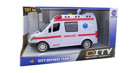 Реалистично воспроизведенная машина скорой помощи издает звуки сирены, гудка, трогается с места и движется задним ходом. На крыше автомобиля горят фонари. Автомобиль имеет задний привод. Передние двери автомобиля открываются.