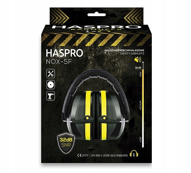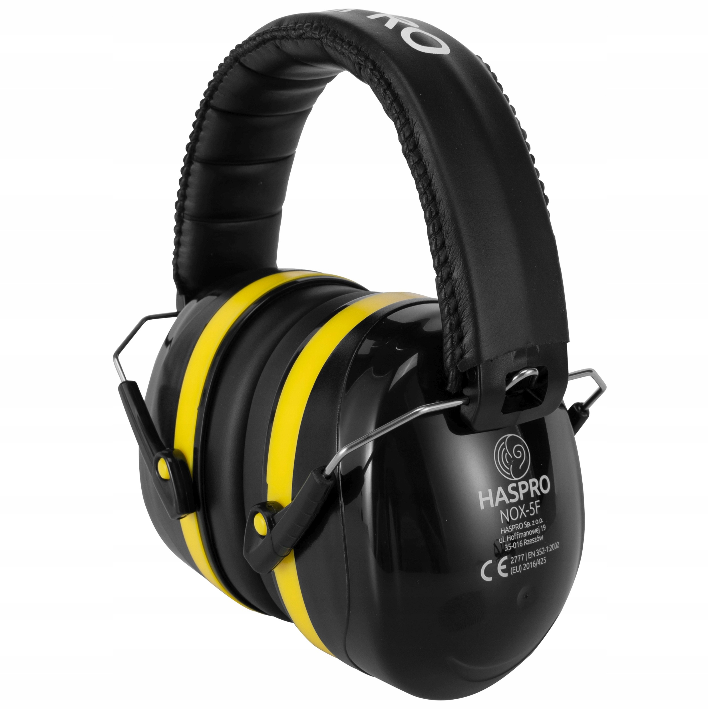 - Антишумные наушники NOX 5F обеспечивают уровень шумоподавления 32 дБ SNR. Более высокие частоты в диапазоне от 2000 до 8000 Гц, типичные для промышленных помещений, снижаются на более высоком уровне, достигая более 40 децибел. Наушники HASPRO NOX 5F оснащены желтой полосой на корпусе, улучшающей обзорность пользователя, что особенно важно при работе в темных помещениях и местах с интенсивным движением транспорта.
