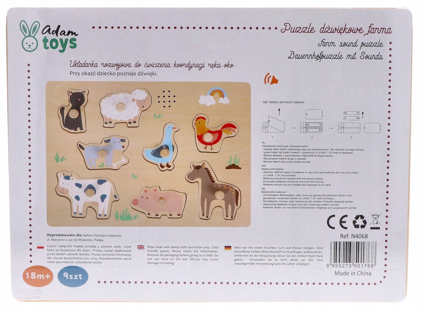 Звуковое предложение от бренда Adam Toys. малыш встречает животных с фермы, приспосабливая свою форму в соответствующее место на головоломке. Если он правильно ставит животное на место, слышит реалистичный звук, который кажется соответствующим животным. Собака лает, кошка, лошадь и т. Д. Головоломка сделана из натуральной древесины, состоящей из основания и 8 сельскохозяйственных животных. Вы найдете здесь: собака, кошка, лошадь, свинья, корова, овца, утка и курица.