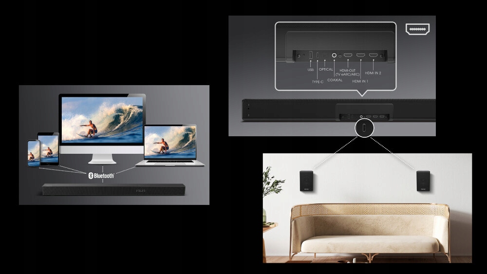 Саундбар предлагает множество вариантов подключения другого оборудования, совместимость с беспроводными задними динамиками объемного звучания, а также поддержку выходов и входов USB, USB-C, оптических, коаксиальных и HDMI. р>