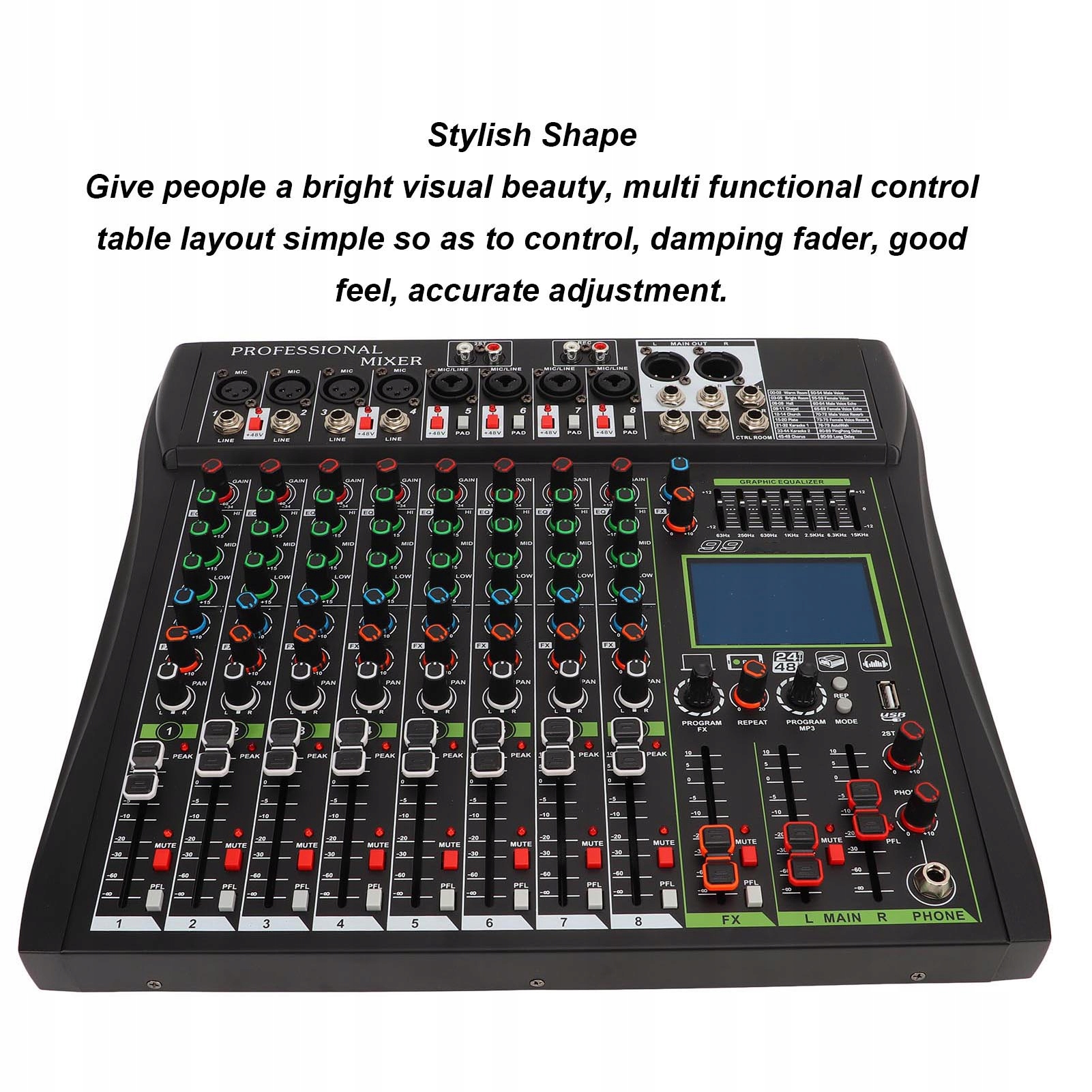 1.Стильная форма: яркая визуальная красота, многофункциональное расположение стола управления, простота в эксплуатации, приятный на ощупь глушитель, точная регулировка. 2.ЖК-дисплей с HD-подсветкой: главный, динамичный, мощный интерфейс работы в режиме реального времени в формате MP3, позволяет переключать воспроизведение источника звука, приостанавливать, выбирать музыку. 3. Беспроводное соединение Bluetooth: нажмите кнопку переключателя, чтобы войти в режим Bluetooth, включите электронное устройство с поддержкой Bluetooth и выполните поиск соединения. 4. Бережная обработка: каждый канал имеет независимую регулировку высоких, средних и низких частот, настройку реверберации и других эффектов, что позволяет деликатно обрабатывать музыку в любое время. 5. Эффект четкого звука: этот микшер обеспечивает точное, четкое и чистое качество звука. Чистый звуковой эффект делает его идеальным для живого микширования в таких случаях, как сценические выступления, вечеринки с диджеями и караоке.