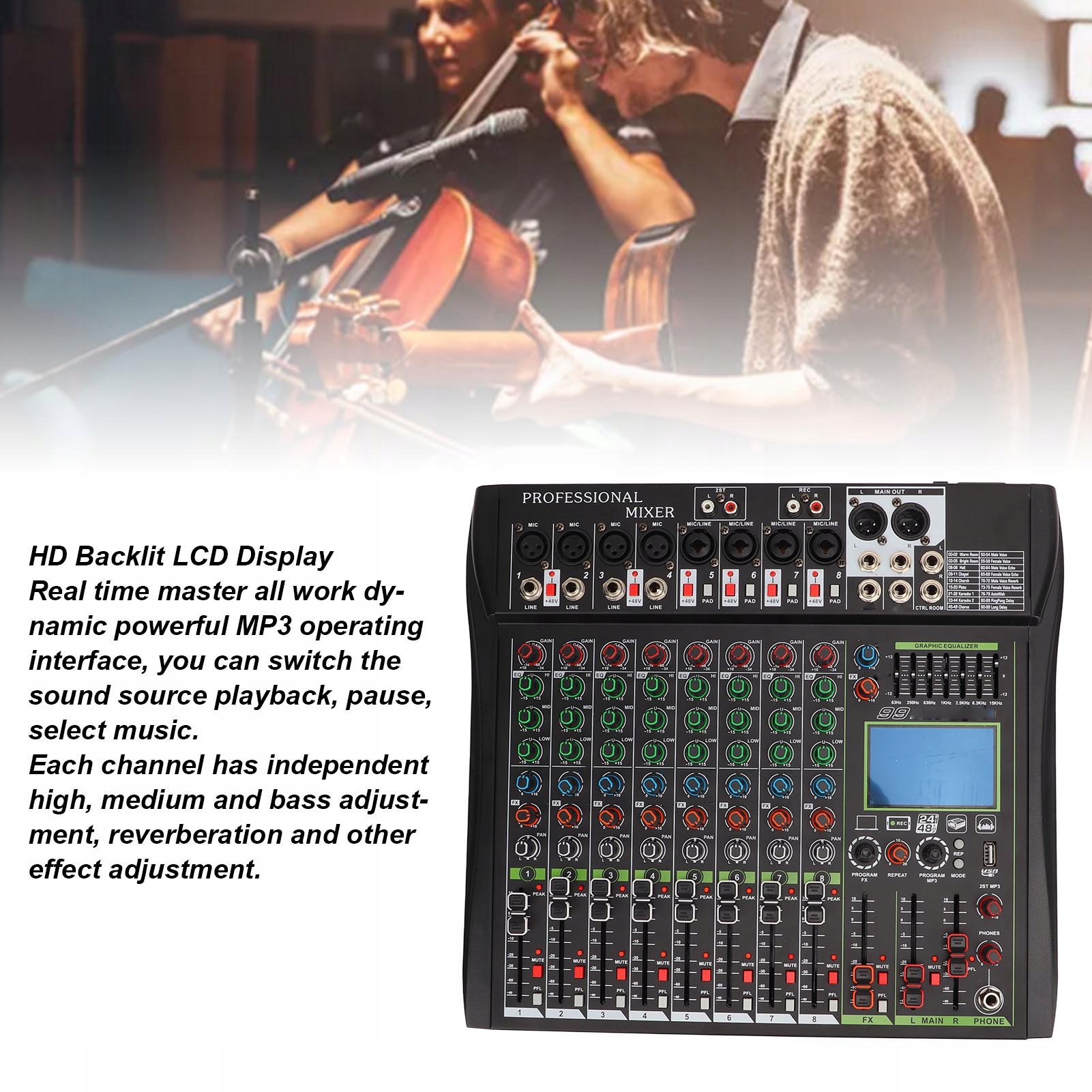 1.Стильная форма: дарит людям яркую визуальную красоту, многофункциональное расположение стола управления, простое управление, глушитель приятный на ощупь, точная регулировка. 2.ЖК-дисплей HD с подсветкой: главный, динамичный, мощный интерфейс работы в режиме реального времени в формате MP3, позволяет переключать воспроизведение источника звука, приостанавливать, выбирать музыку. 3. Беспроводное соединение Bluetooth: нажмите кнопку переключателя, чтобы войти в режим Bluetooth, включите электронное устройство с поддержкой Bluetooth и выполните поиск соединения. 4. Бережная обработка: каждый канал имеет независимую регулировку высоких, средних и низких частот, настройку реверберации и других эффектов, что позволяет деликатно обрабатывать музыку в любое время. 5. Эффект четкого звука: этот микшер обеспечивает точное, четкое и чистое качество звука. Чистый звуковой эффект делает его идеальным для живого микширования в таких случаях, как сценические выступления, вечеринки с диджеями и караоке.