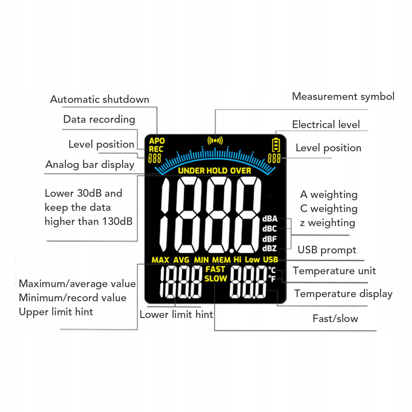 4. Очистить дисплей: с прозрачным цифровым цифровым дисплеем вы можете легко прочитать показания звука, чтобы получить точные результаты измерения, полезное и практичное