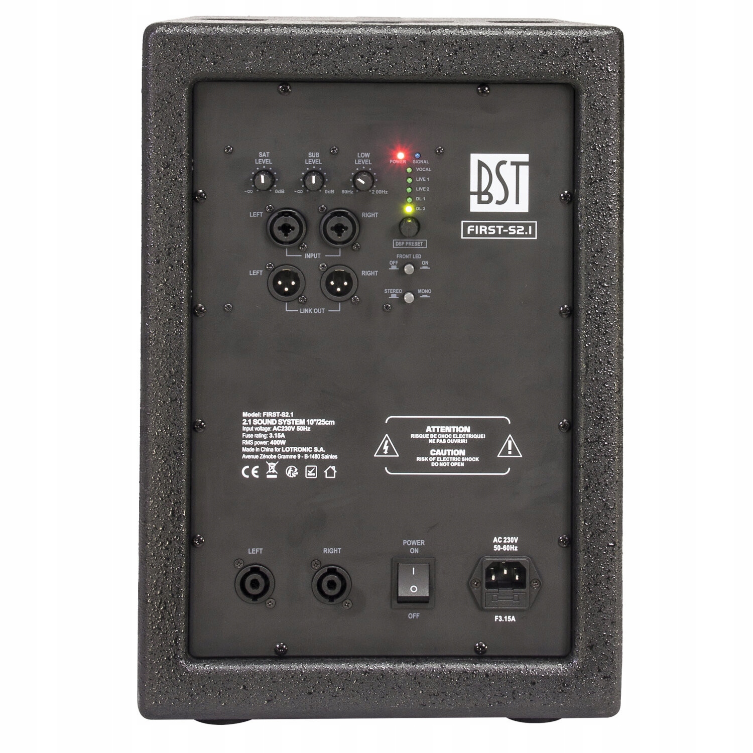 Он оснащен усилителем мощности класса D, клип-лимитером и современным DSP-процессором. Доступно 5 различных настроек DSP (Vocal/Live1/Live2/DJ1/DJ2). Частоту разделения сабвуфера можно легко регулировать от 80 Гц с помощью поворотного потенциометра до 200 Гц. Благодаря выходам XLR аудиосигнал также можно передавать на другие системы. Громкость верхних частей и сабвуфера можно регулировать отдельно.
