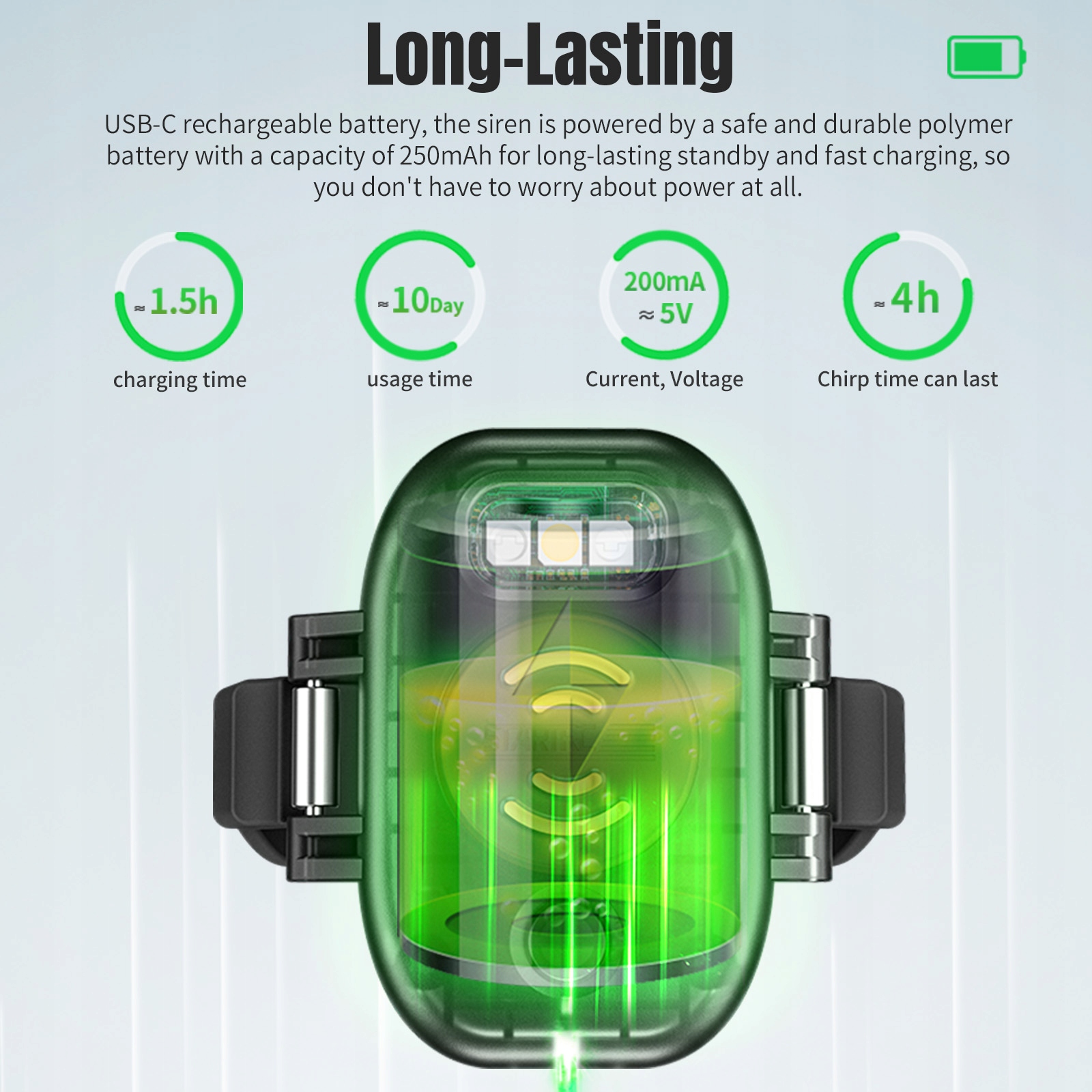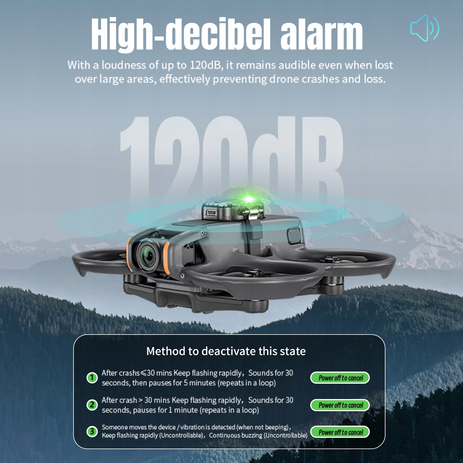 【Мощная сирена мощностью 120 дБ и светодиодная лампа яркостью 100 люмен】 Оснащено сверхгромким зуммером мощностью 120 дБ. и яркий светодиод на 100 люмен, этот сигнал тревоги поможет вам быстро найти свой дрон. Он имеет интеллектуальные триггеры автоматической активации: сигнал тревоги будет звучать и мигать, если устройство бездействует в течение 10 минут, дрон находится под напряжением более часа или чувствует, что дрон падает. Новое обновление V2: нет необходимости использовать приложение для подключения к телефону, более удобно в использовании.