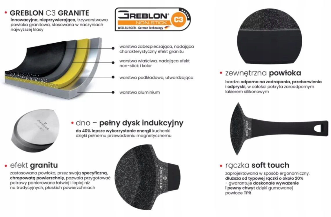 pienni wyger с лисовым глицевым глифом . Современное, немецкое гранитное покрытие greblon® охватывает внутреннюю часть судна. Благодаря инновационной технологии, Pan идеально проводит и накапливает тепло . Благодаря своим уникальным свойствам, повышению сопротивления царапин, покрытие Greblon используется в судах с самым высоким классом. Кроме того, тепло -резистентный силиконовый лак, который охватывает кастрюлю, заставляет его сохранить свой эстетический вид на долгое время