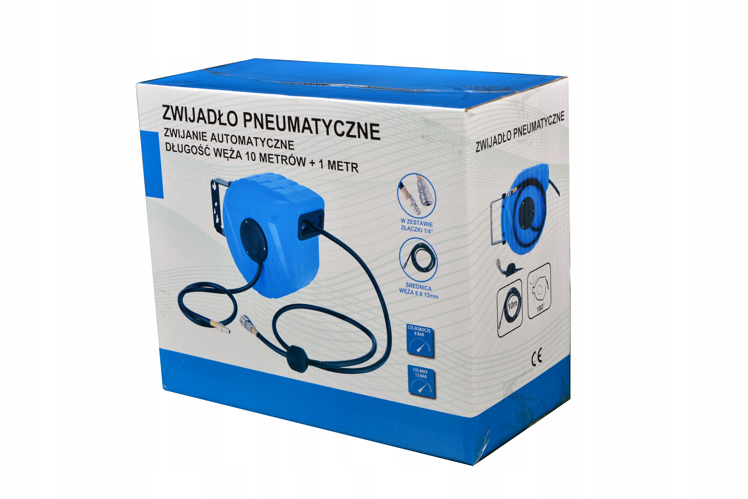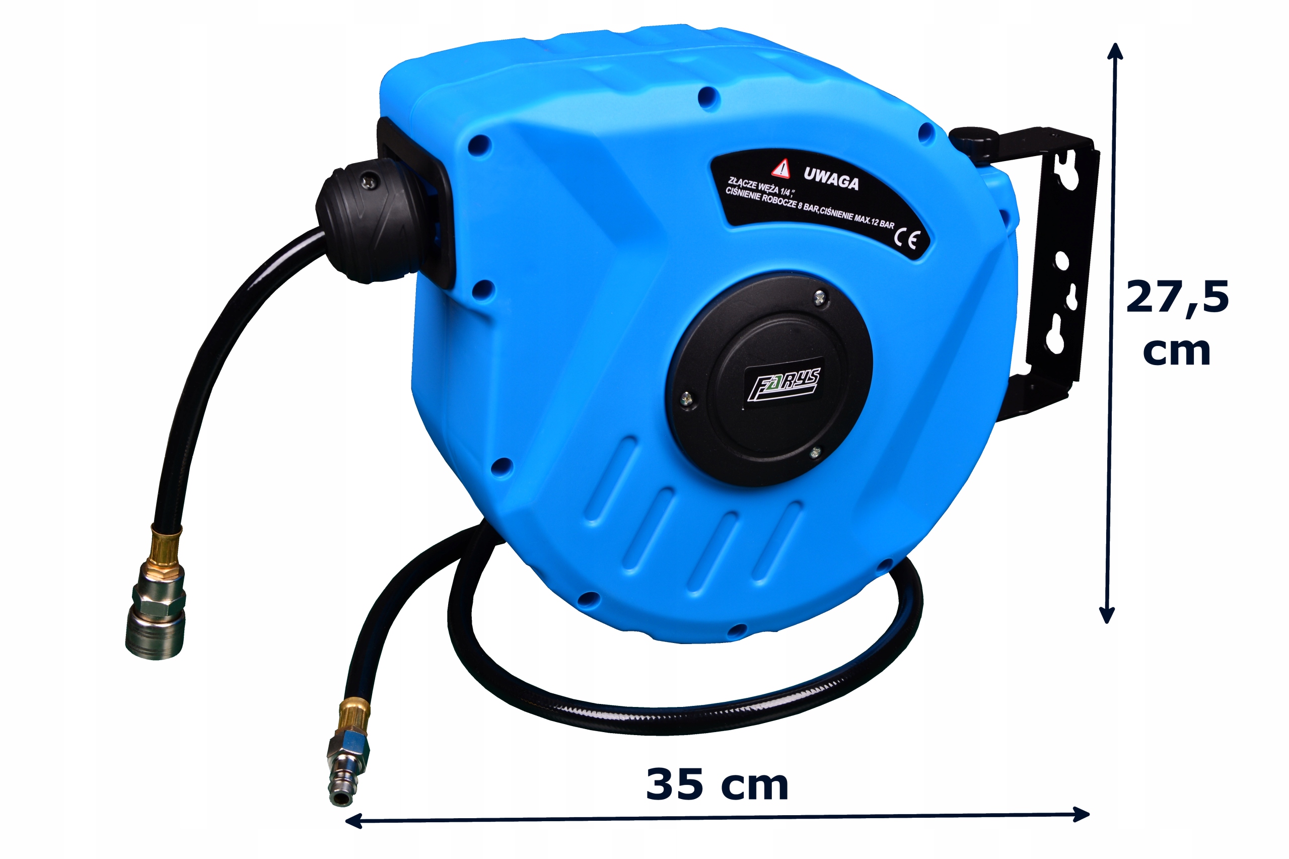 Пневматическая катушка для шланга Farys. Он имеет функцию автоматического поворота и может быть закреплен на стене (дюбели входят в комплект). Идеально подходит для мест, где необходимо поддерживать порядок.