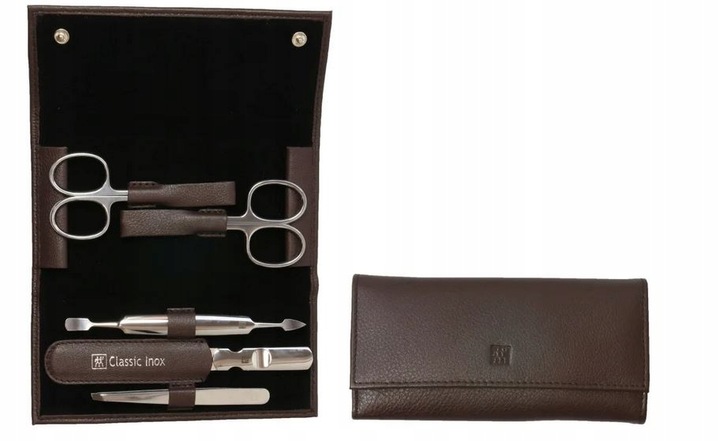 Дорожный набор для ухода за ногтями из нержавеющей стали. Коричневый кожаный футляр, 5 предметов Classic Inox Zwilling.