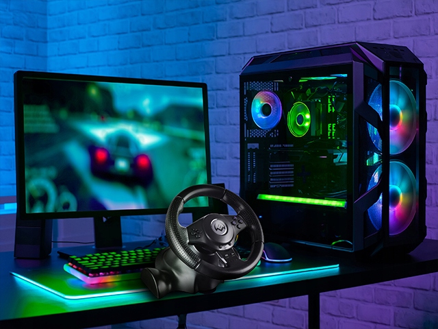 В новинке, конечно же, предусмотрена виброотдача, что позволяет глубоко погрузиться в игровой мир и почувствовать каждую деталь – от езды по поверхности или бездорожью, до характерного поведения руля при повороте или заносе. Специальный рычаг позволяет переключать передачи – как в реальной жизни. И, конечно же, педальный блок увеличенной ширины, что порадует обладателей больших ног — не многие игровые рули могут похвастаться этим.