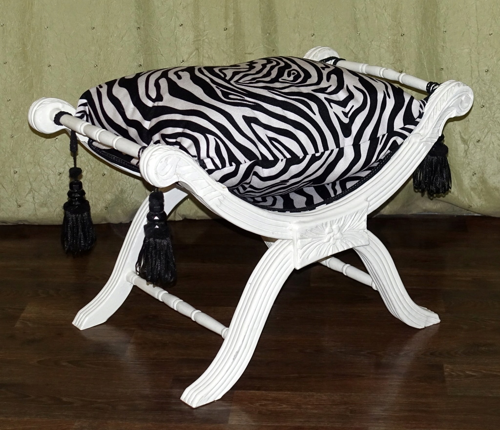 Стильный зиделек - сиденье, выполненное в современном стиле. Деревянная мебельная конструкция с тонкой резьбой по всей поверхности цвета антик-белый. Подушка из материала с рисунком зебры; отделаны декоративной бахромой по углам. Его можно использовать как сиденье в прихожей при переобувании, в ванной при туалете или как дополнительное сиденье в гостиной, когда приходит больше гостей.