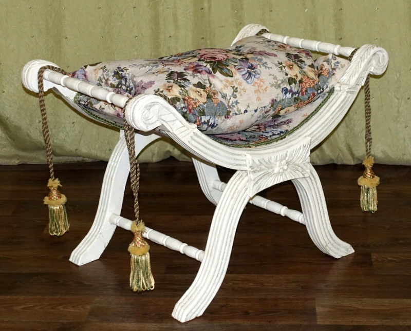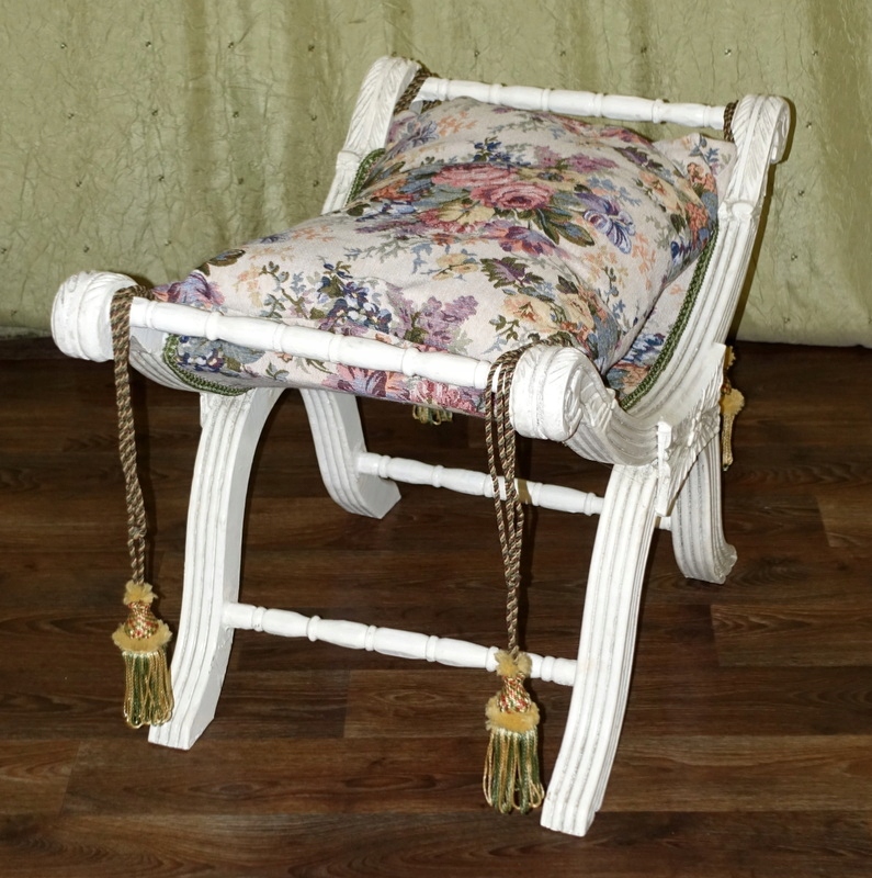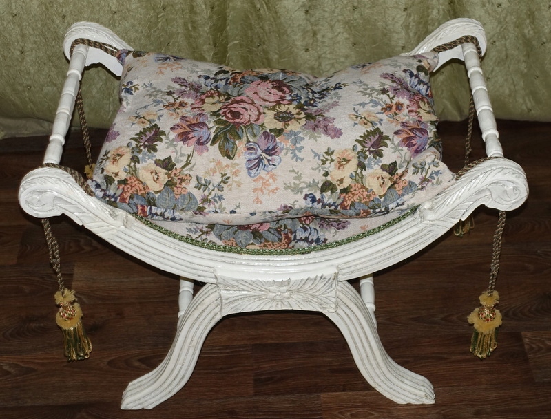 Стильный зиделек - сиденье, выполненное в современном стиле. Деревянная мебельная конструкция с тонкой резьбой по всей поверхности цвета антик-белый. Подушка изготовлена из гобеленового материала с цветочным мотивом, отделана декоративной бахромой по углам. Его можно использовать как сиденье в прихожей при переобувании, в ванной при туалете или как дополнительное сиденье в гостиной, когда приходит больше гостей.