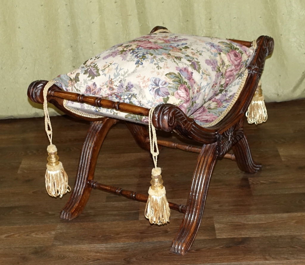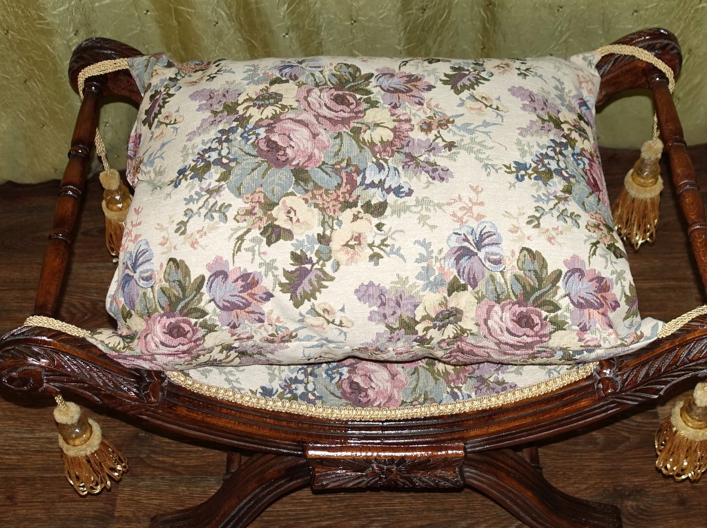 Стильный зиделек - сиденье, выполненное в современном стиле. Деревянная мебельная конструкция, тонко вырезанная по всей поверхности цвета темного ореха. Подушка изготовлена из гобеленового материала с цветочным мотивом, отделана декоративной бахромой по углам. Его можно использовать в качестве сиденья в прихожей при переобувании, в ванной при пользовании туалетом или как дополнительное место в гостиной, когда приходит больше гостей.