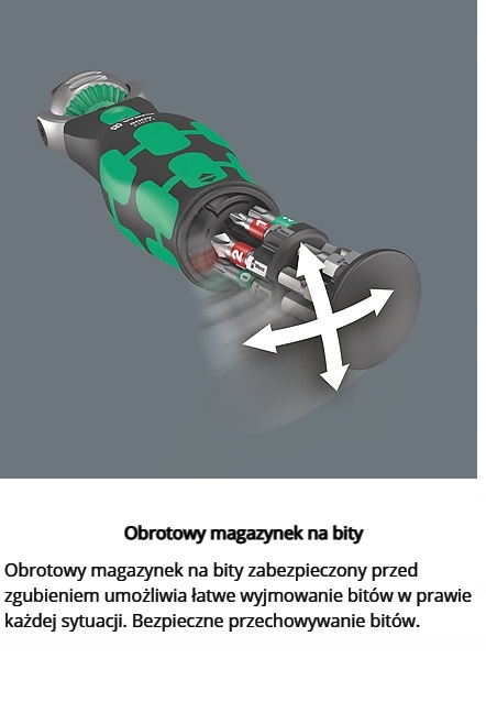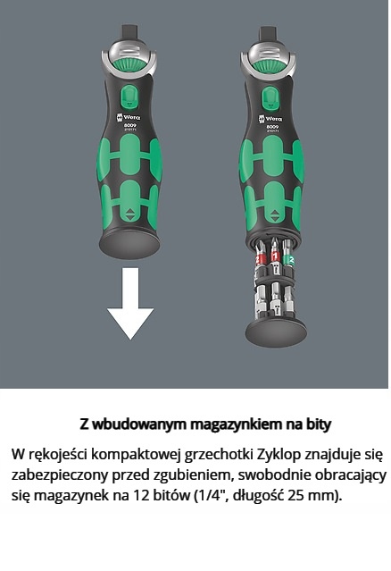 Компактная трещотка Zyklop с магазином бит помещается в кармане брюк. Прямой магнитный держатель для бит ¼ дюйма и торцевых ключей 3/8 дюйма. Очень быстрая смена инструмента благодаря быстрозажимному патрону. Головка с фиксацией в положениях 0°, 15° и 90° позволяет использовать инструмент как отвертку с трещоткой и храповым механизмом. Мелкозубчатый храповой механизм с 72 зубьями обеспечивает небольшой угол возврата храпового механизма, составляющий всего 5°. Широкий спектр применения благодаря 12 насадкам, встроенным в рукоятку. Прочный храповой механизм обеспечивает необходимый крутящий момент. Идеальное сочетание трещотки Zyklop и набора отверток из 12 предметов.