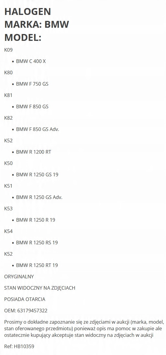 Просматривая «, ГАЛОГЕННЫЕ ЛАМПЫ BMW R1200RT R 1200 RT F850 F750 GS», вы можете быть уверены, что данный товар из каталога «Галогены» будет доставлен из Польши и проверен на целостность. В цене товара, указанной на сайте, учтена доставка из Польши. Внимание!!! Товары для Евросоюза, согласно законодательству стран Евросоюза, могут отличаться упаковкой или наполнением.