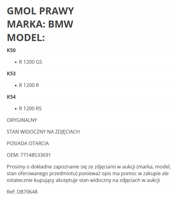 Просматривая «, КРЫШКА РУЛЯ GMOL L BMW R 1200 GS RS R R1200GS R1250 K50 K53 K54», вы можете быть уверены, что данный товар из каталога «Рамка» будет доставлен из Польши и проверен на целостность. В цене товара, указанной на сайте, учтена доставка из Польши. Внимание!!! Товары для Евросоюза, согласно законодательству стран Евросоюза, могут отличаться упаковкой или наполнением.