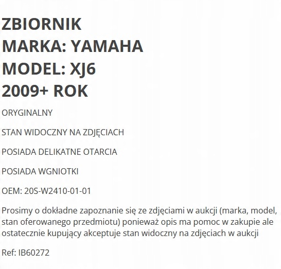 Просматривая «, Топливный бак Bak Yamaha xj6 xj 6 09+», вы можете быть уверены, что данный товар из каталога «Топливные баки» будет доставлен из Польши и проверен на целостность. В цене товара, указанной на сайте, учтена доставка из Польши. Внимание!!! Товары для Евросоюза, согласно законодательству стран Евросоюза, могут отличаться упаковкой или наполнением.