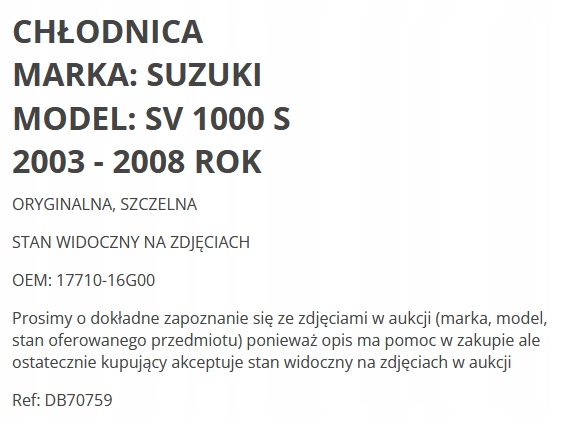 Просматривая «, Suzuki SV 1000 S SV1000 03-08 Cooler», вы можете быть уверены, что данный товар из каталога «Радиаторы» будет доставлен из Польши и проверен на целостность. В цене товара, указанной на сайте, учтена доставка из Польши. Внимание!!! Товары для Евросоюза, согласно законодательству стран Евросоюза, могут отличаться упаковкой или наполнением.