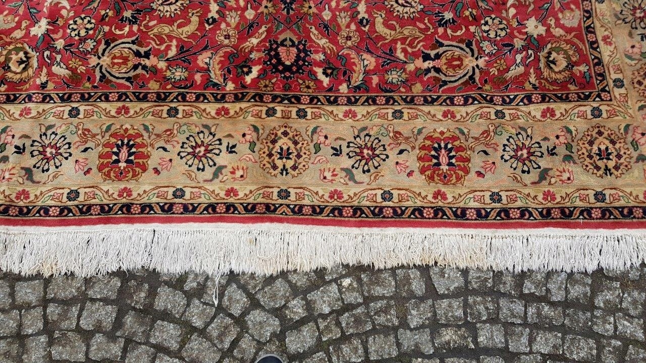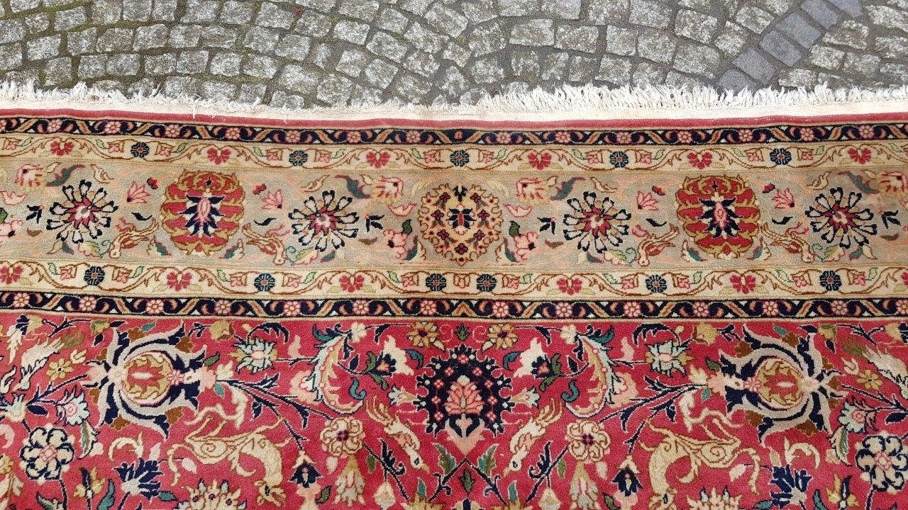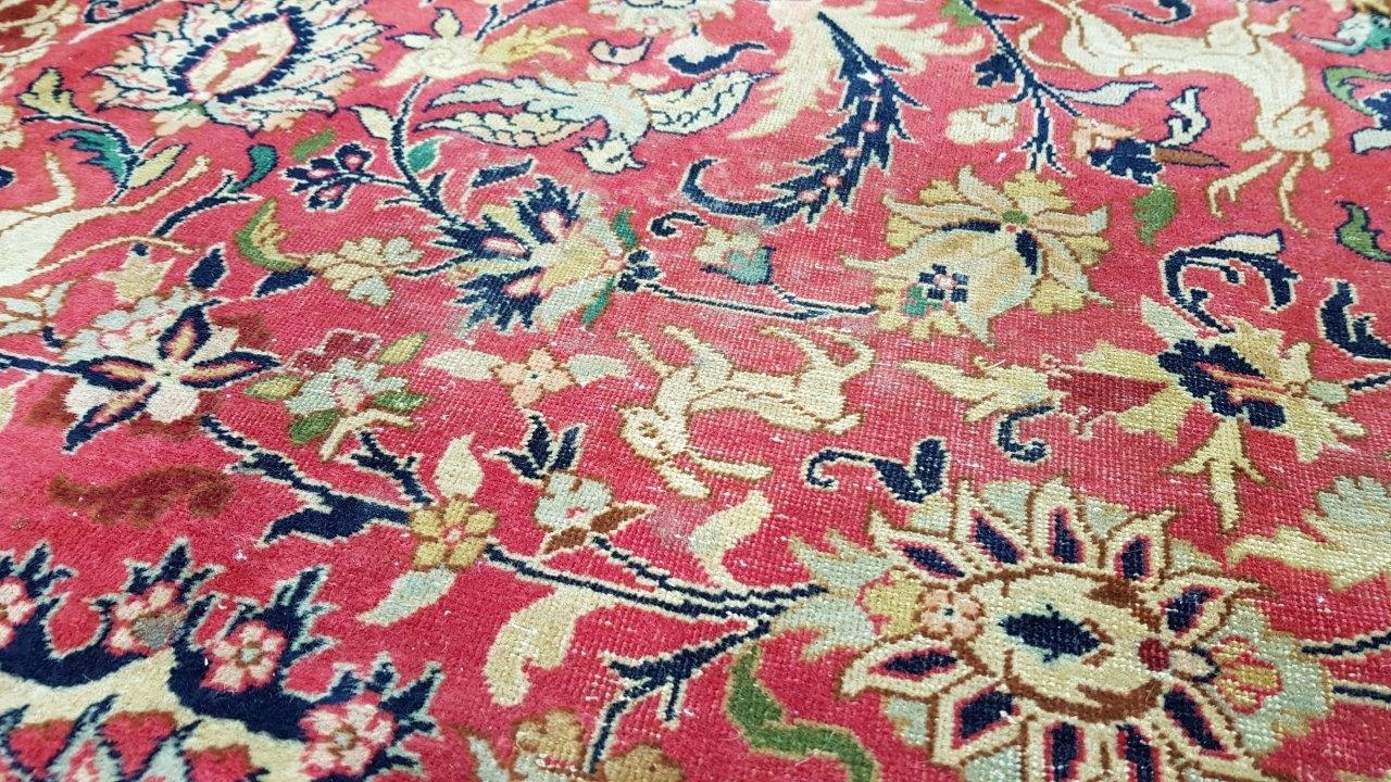 Перський старий ісфаханський килим. Пробка ручного плетення з вовни найвищої якості. Характеризується приємним на дотик, блискучим флісом і красивими кольорами та візерунками. Він у стані, який видно на фото, має потертості та дірку.