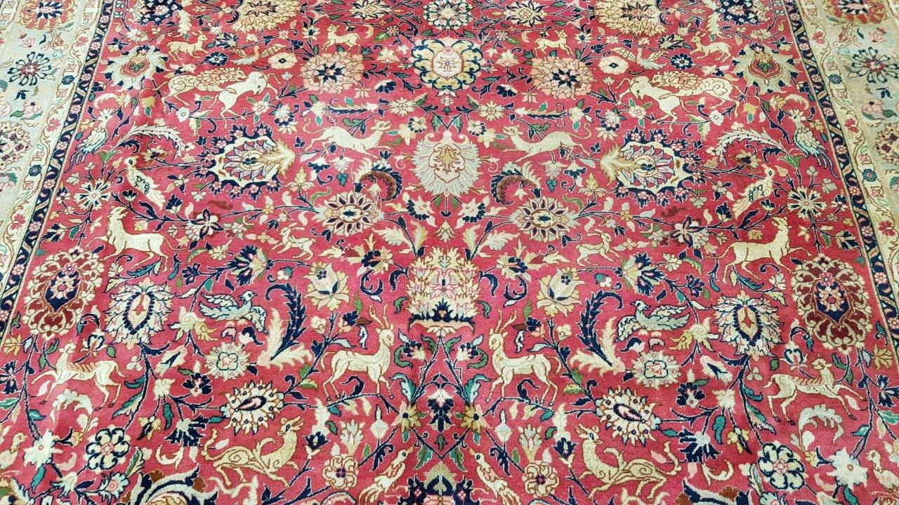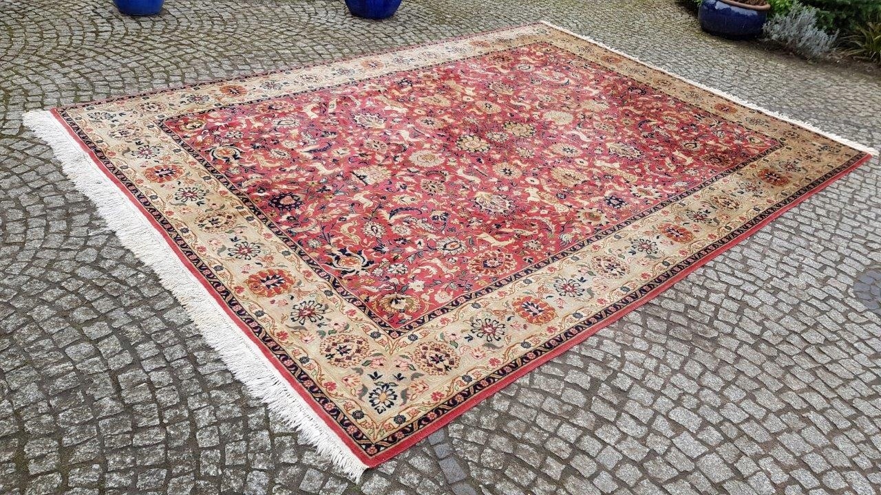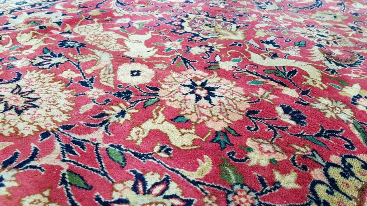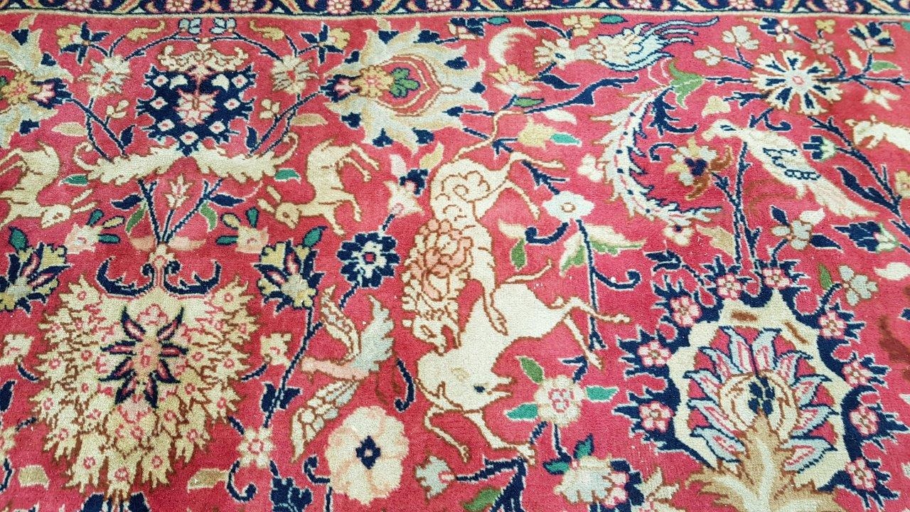 Перський старий ісфаханський килим. Пробка ручного плетення з вовни найвищої якості. Характеризується приємним на дотик, блискучим флісом і красивими кольорами та візерунками. Він у стані, який видно на фото, має потертості та дірку.