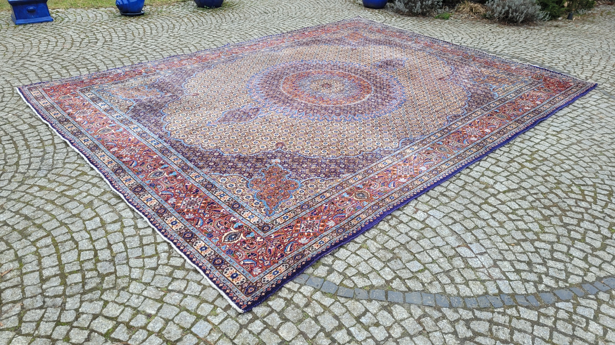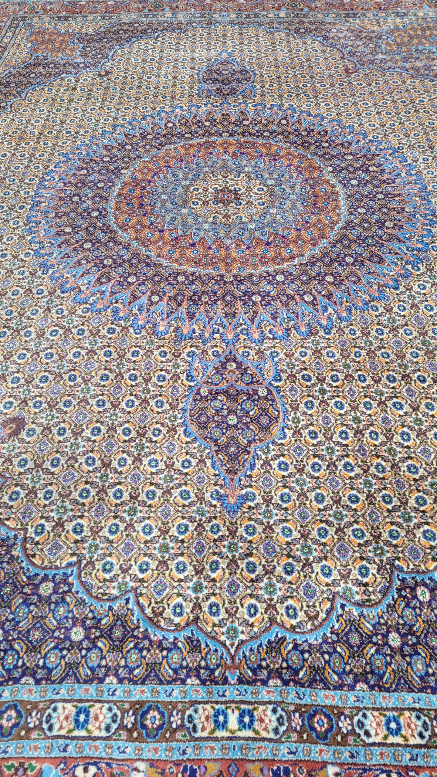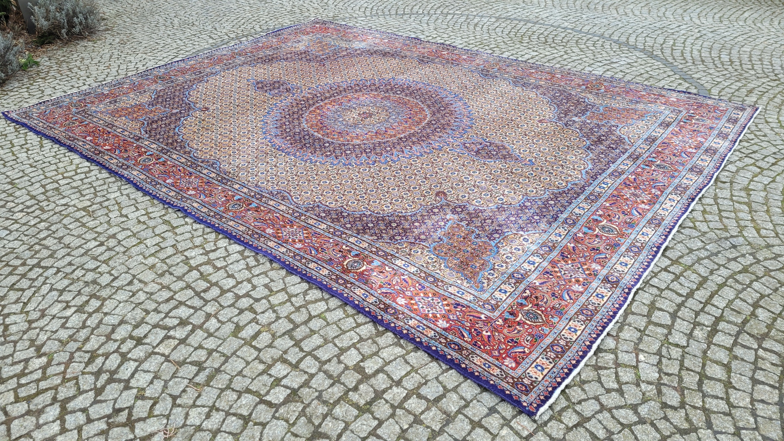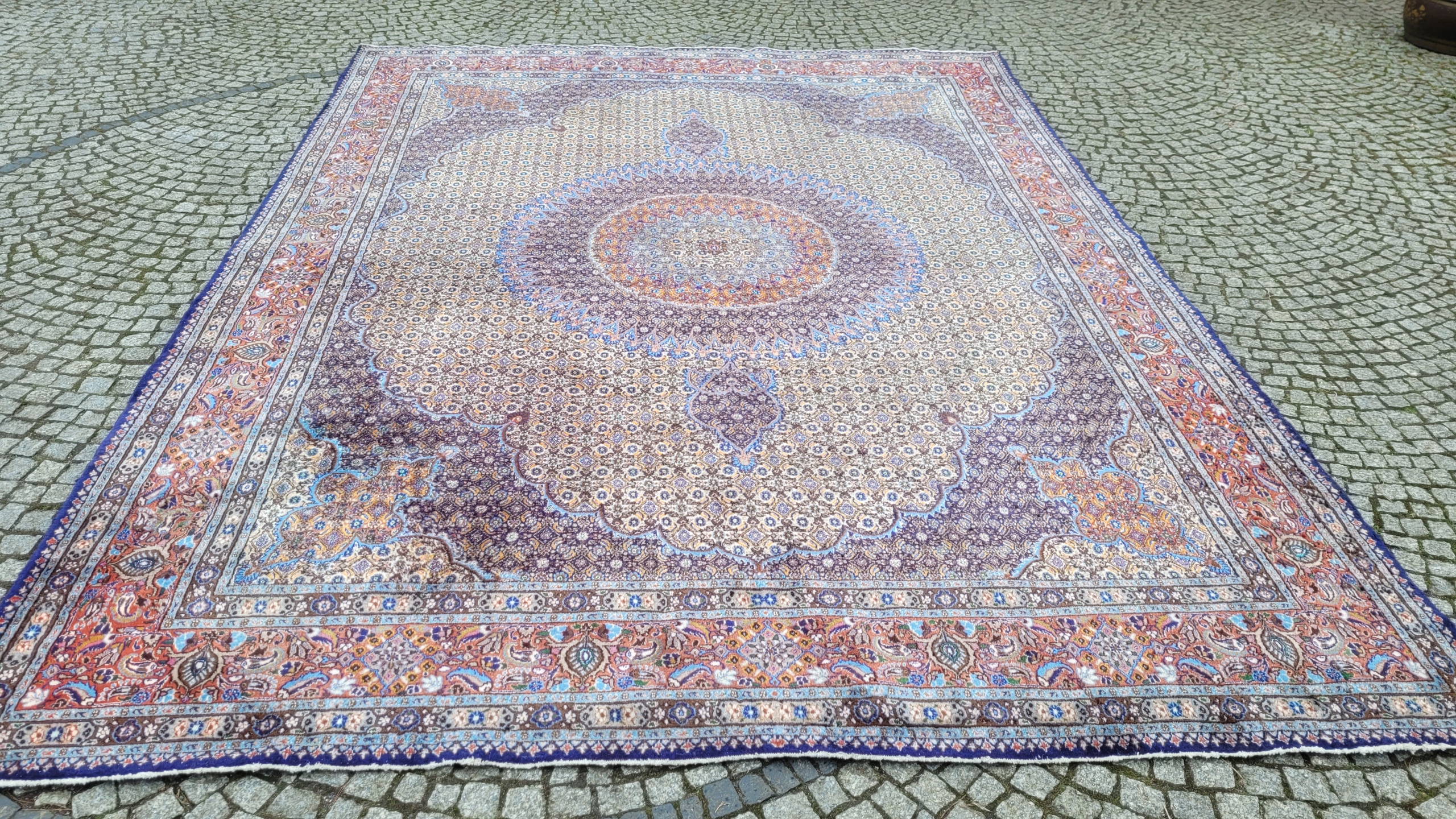 Перський килим Муд. Тканий шерсть і шовк. Він характеризується компактним, приємним на дотик, блискучим флісом та красивими кольорами та дизайном. Він зберігається в хорошому стані, видно на знімках. У ньому є скорочення недоліків.