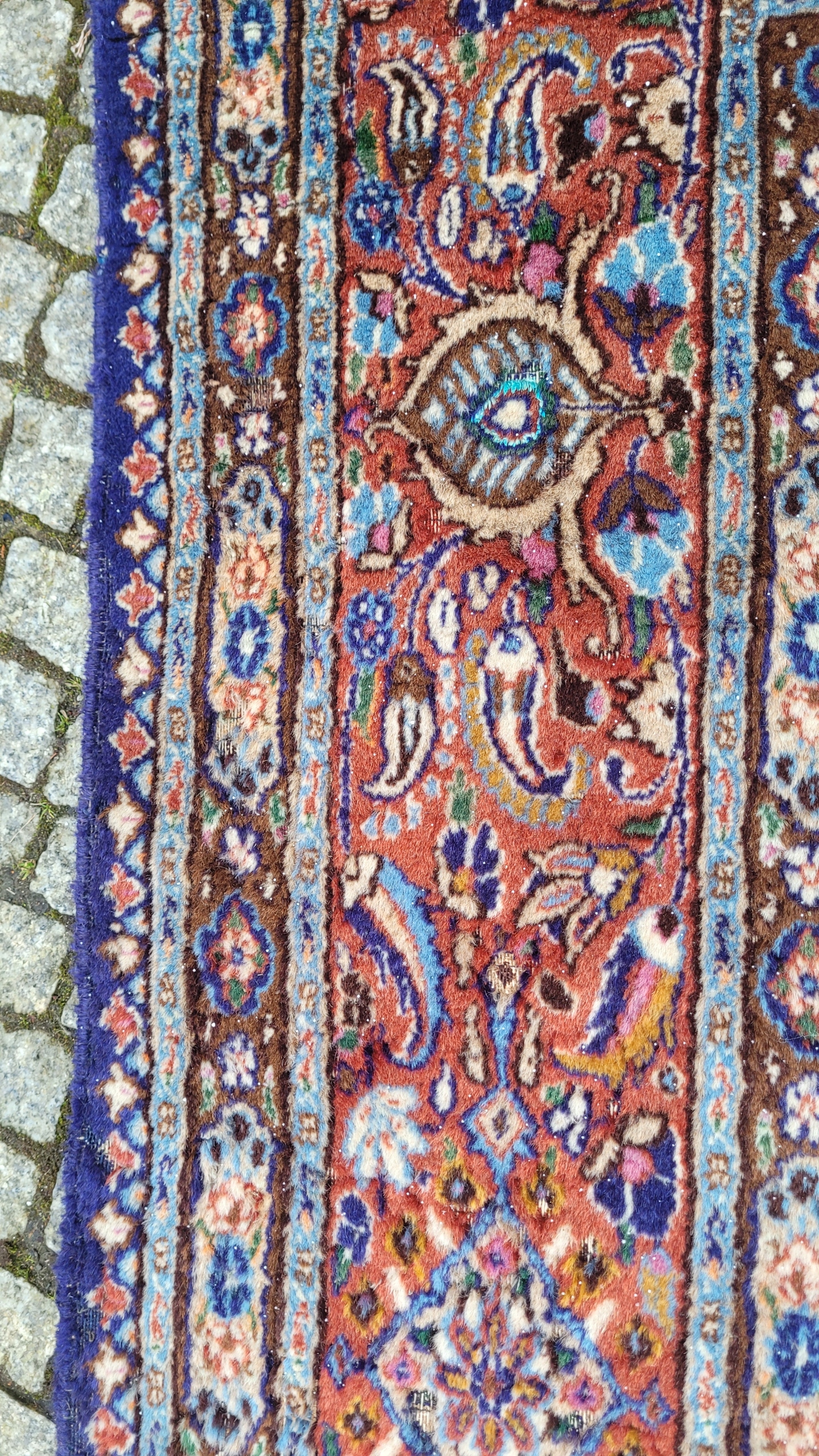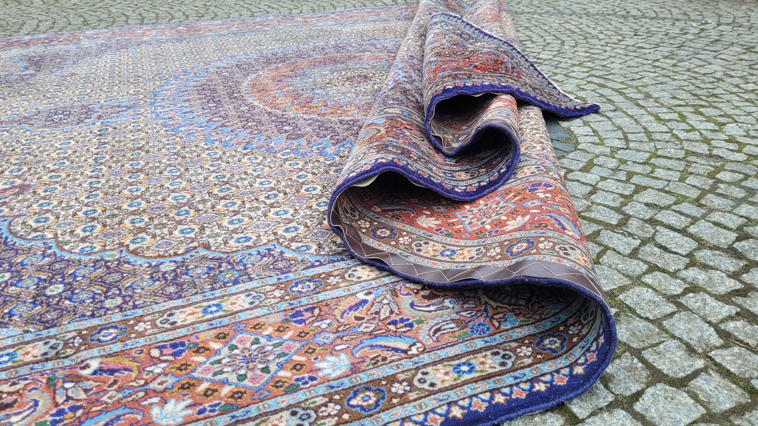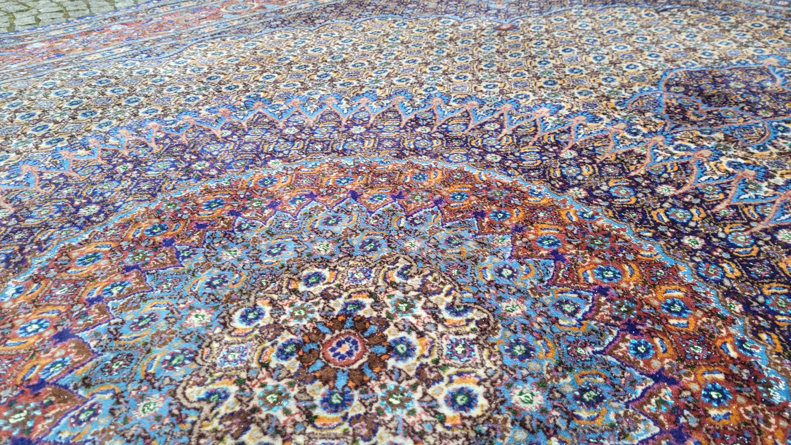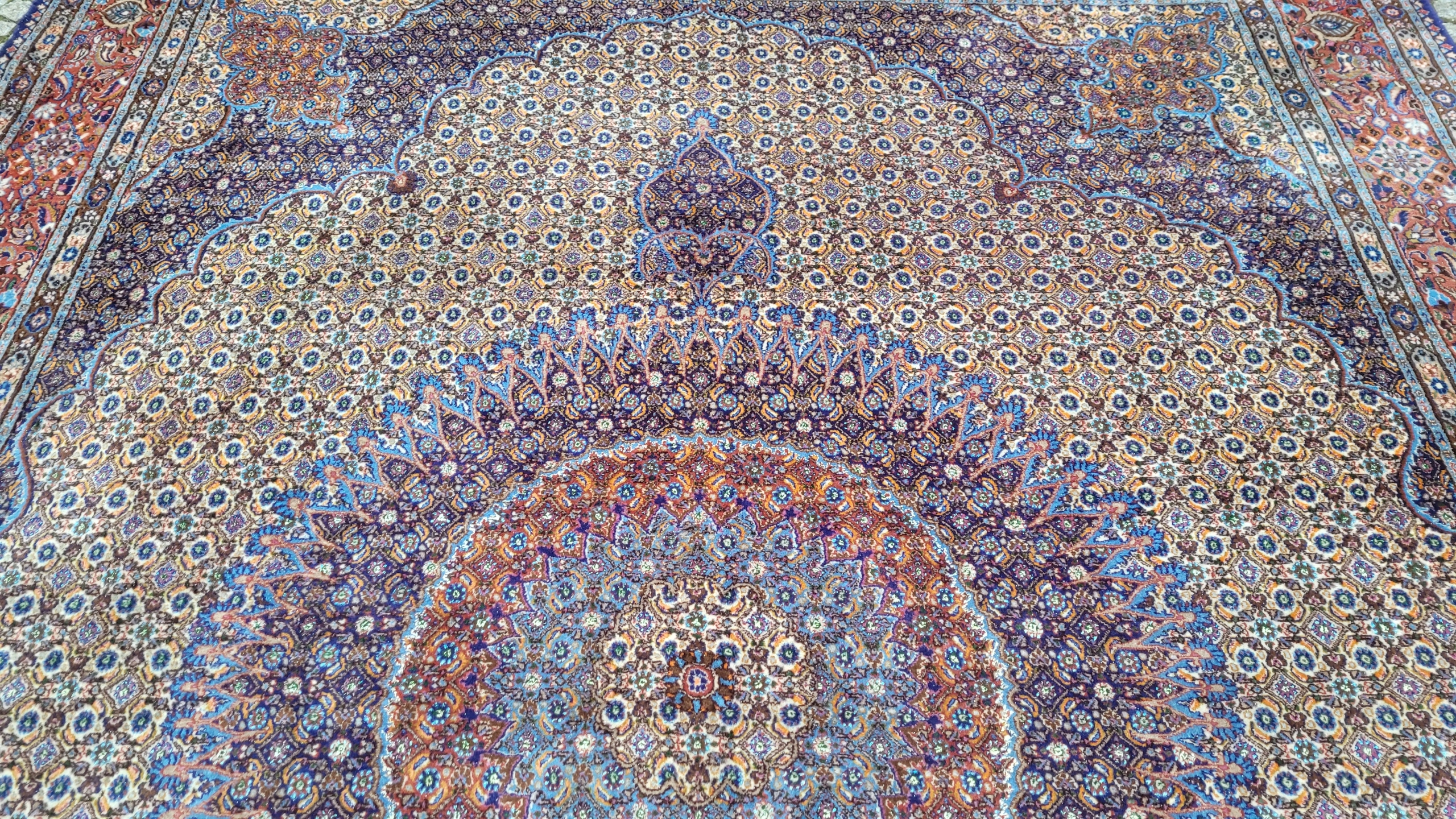Перський килим Муд. Тканий шерсть і шовк. Він характеризується компактним, приємним на дотик, блискучим флісом та красивими кольорами та дизайном. Він зберігається в хорошому стані, видно на знімках. У ньому є скорочення недоліків.