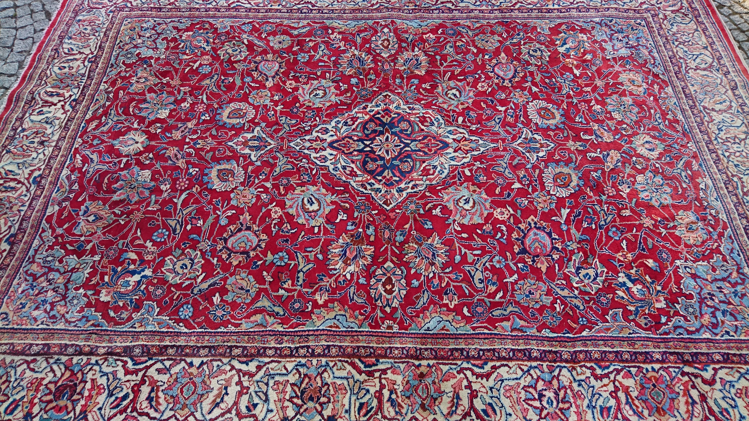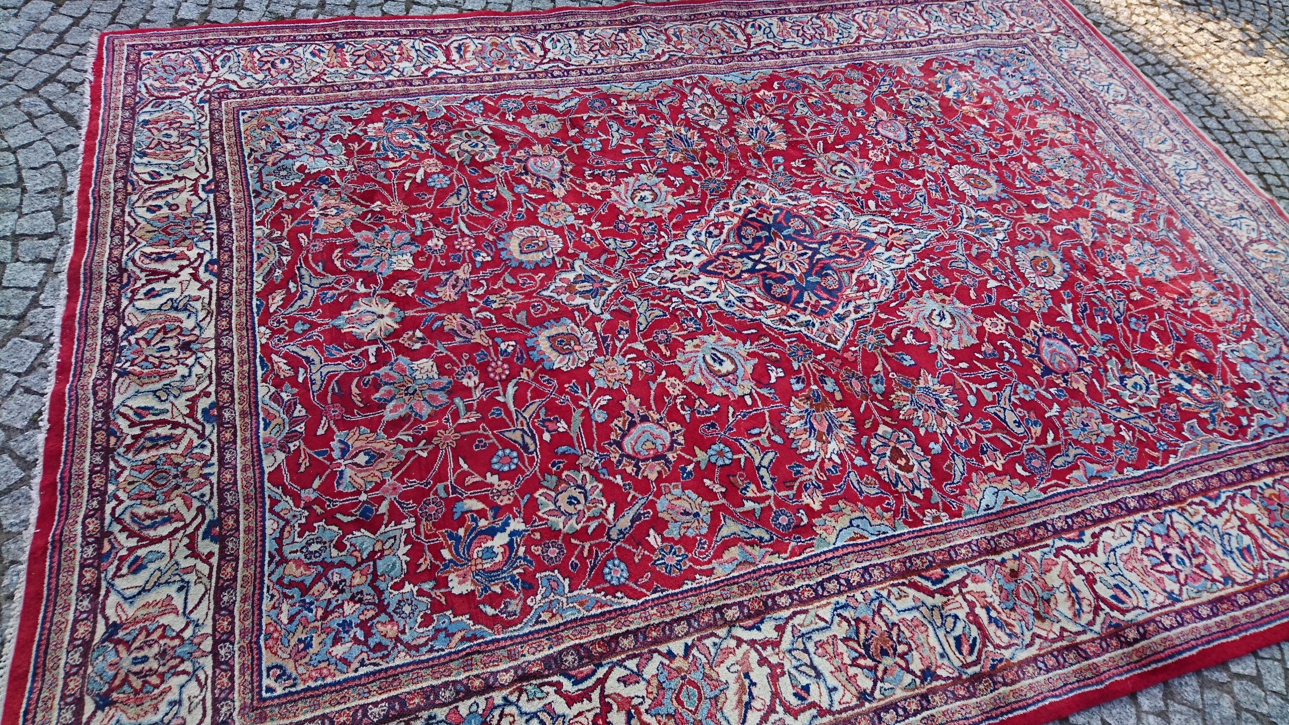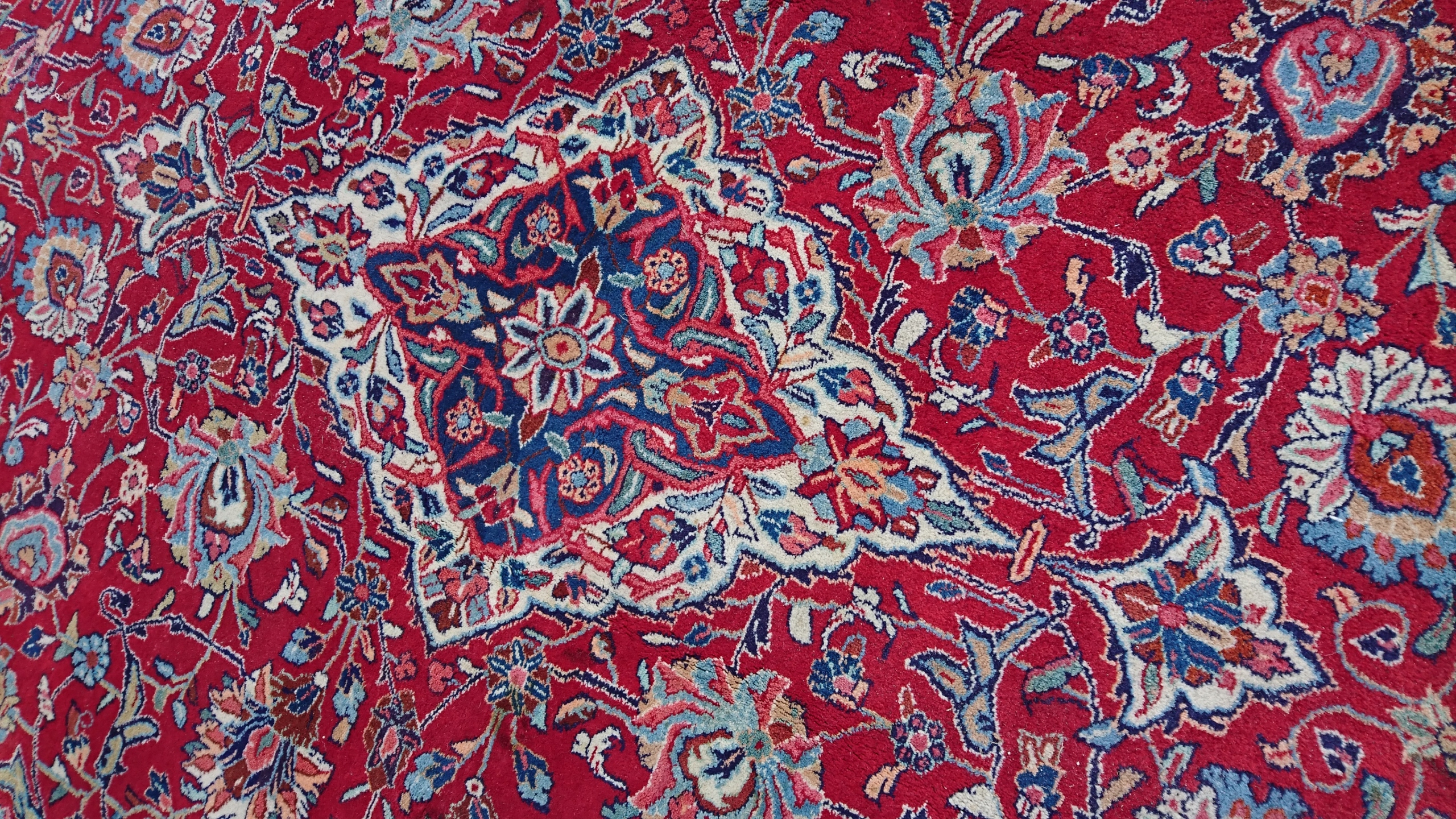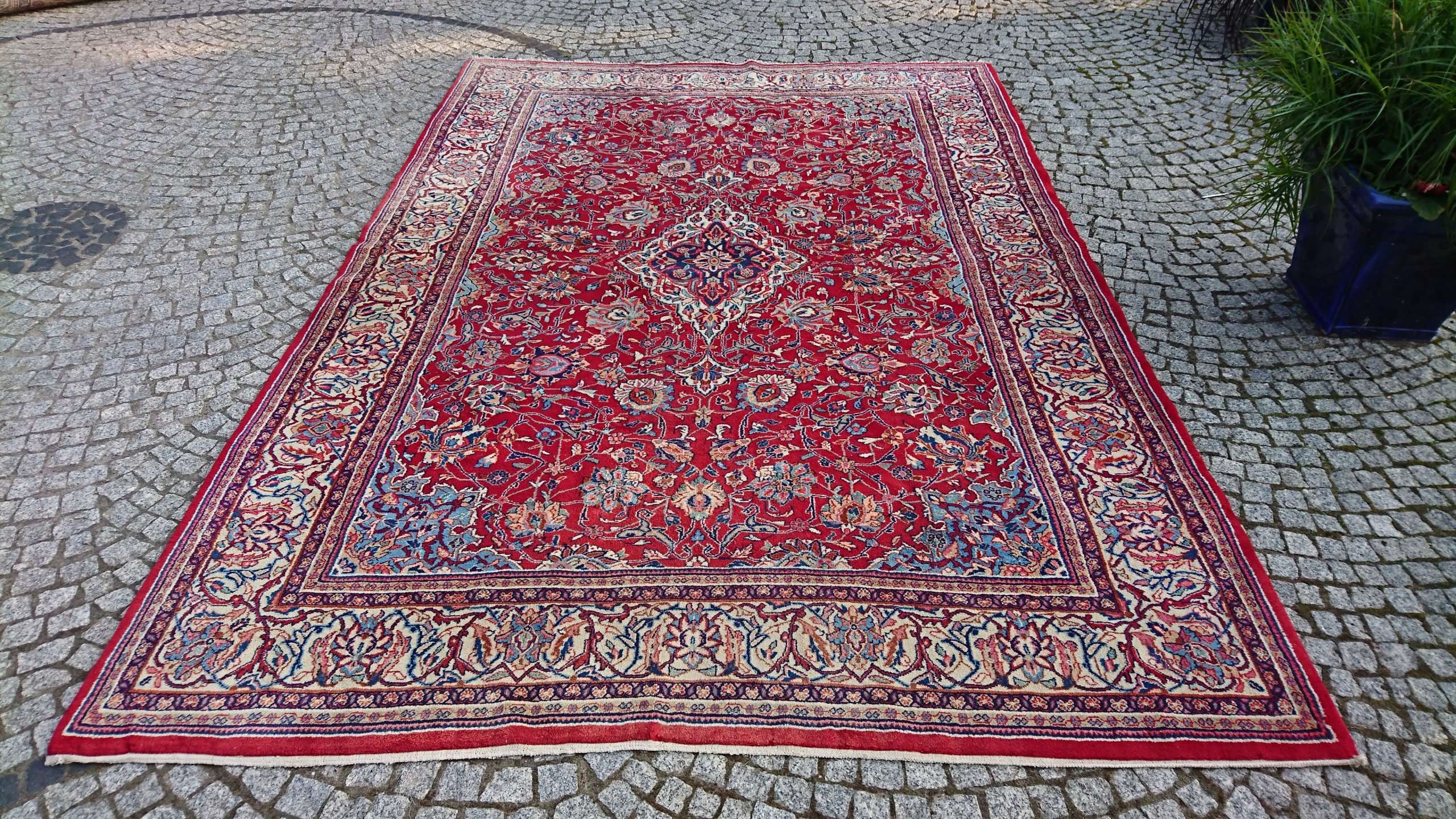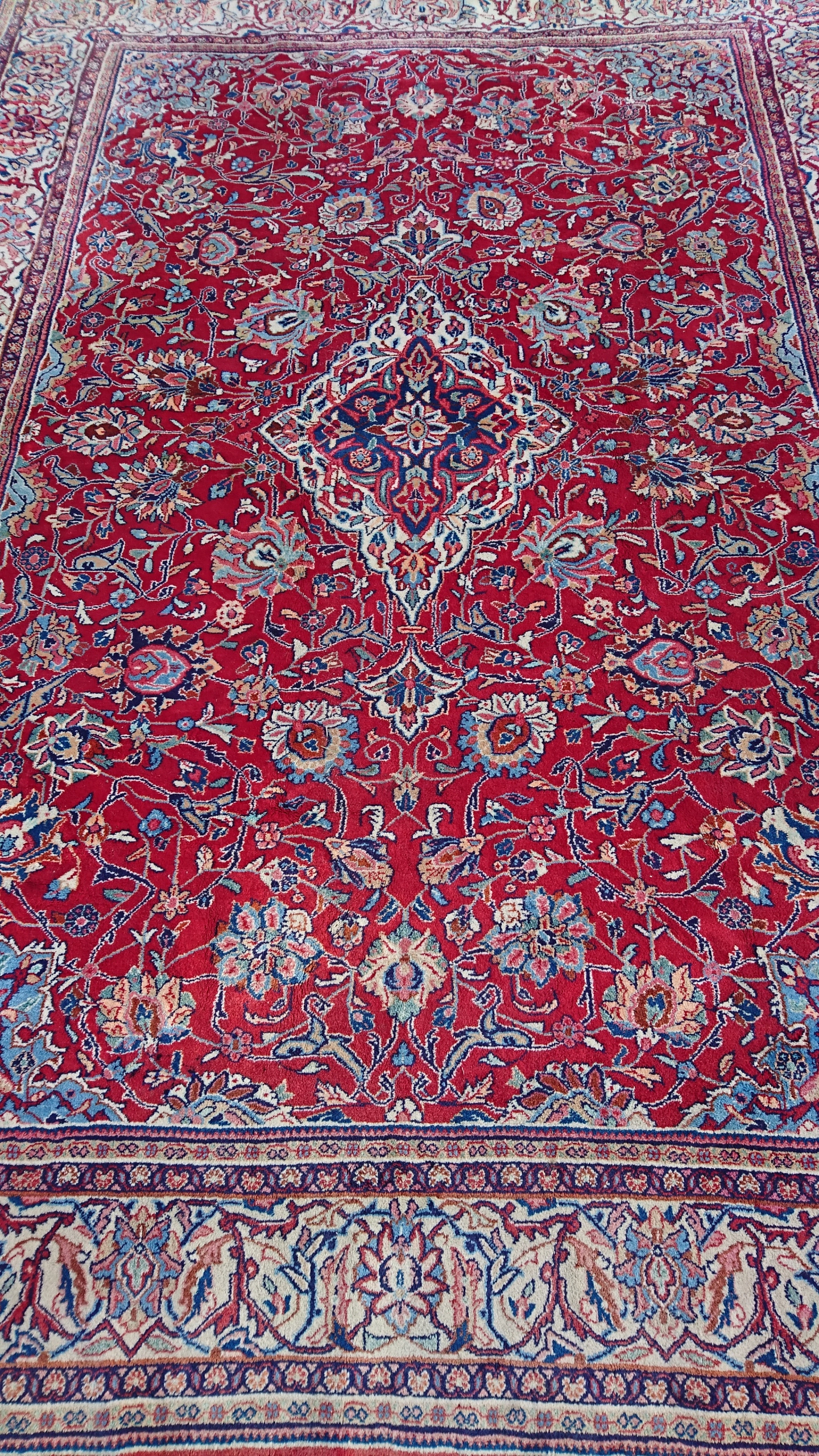 Перський килим саруг. Виткана вручну з вовни найвищої якості. Характеризується компактним, приємним на дотик, блискучим флісом і красивими кольорами та візерунками. Він у дуже хорошому стані.