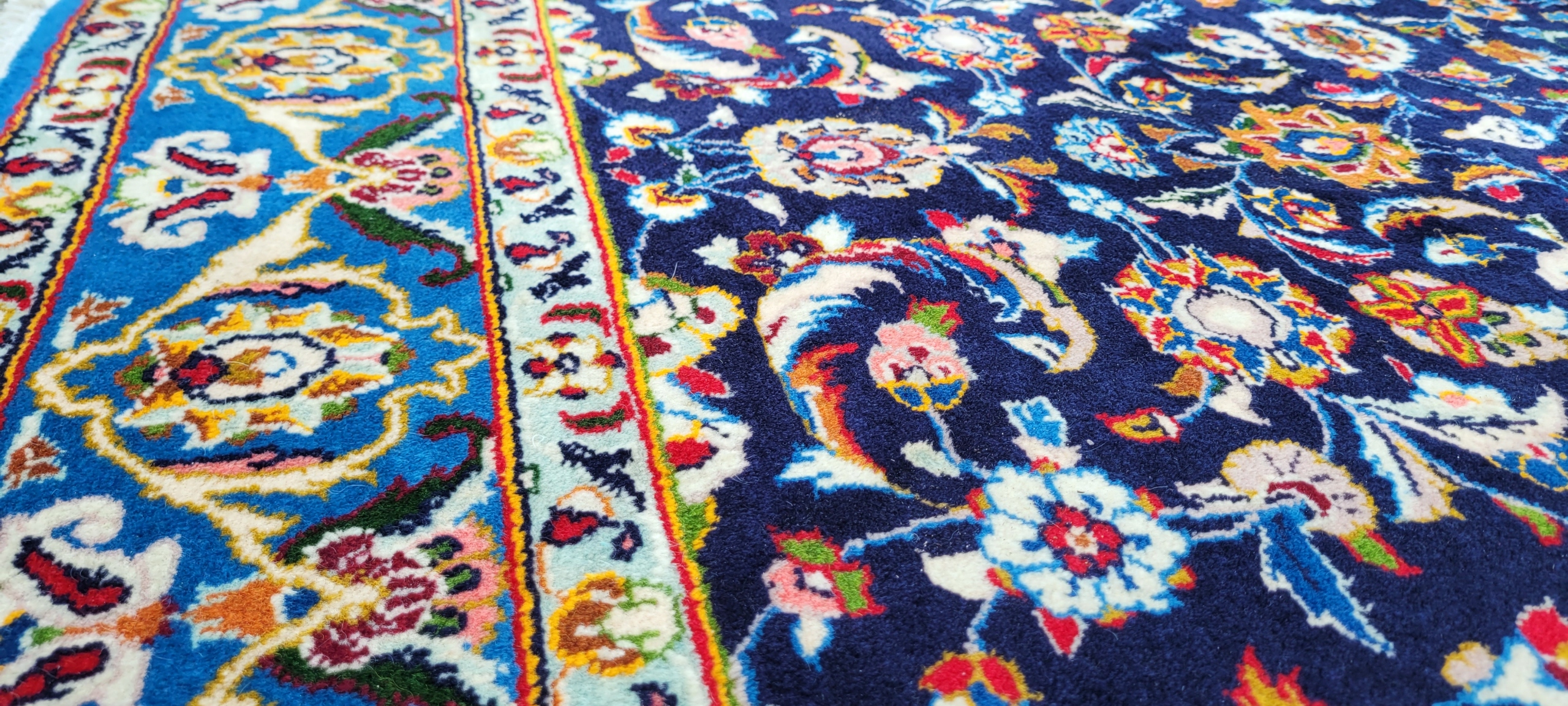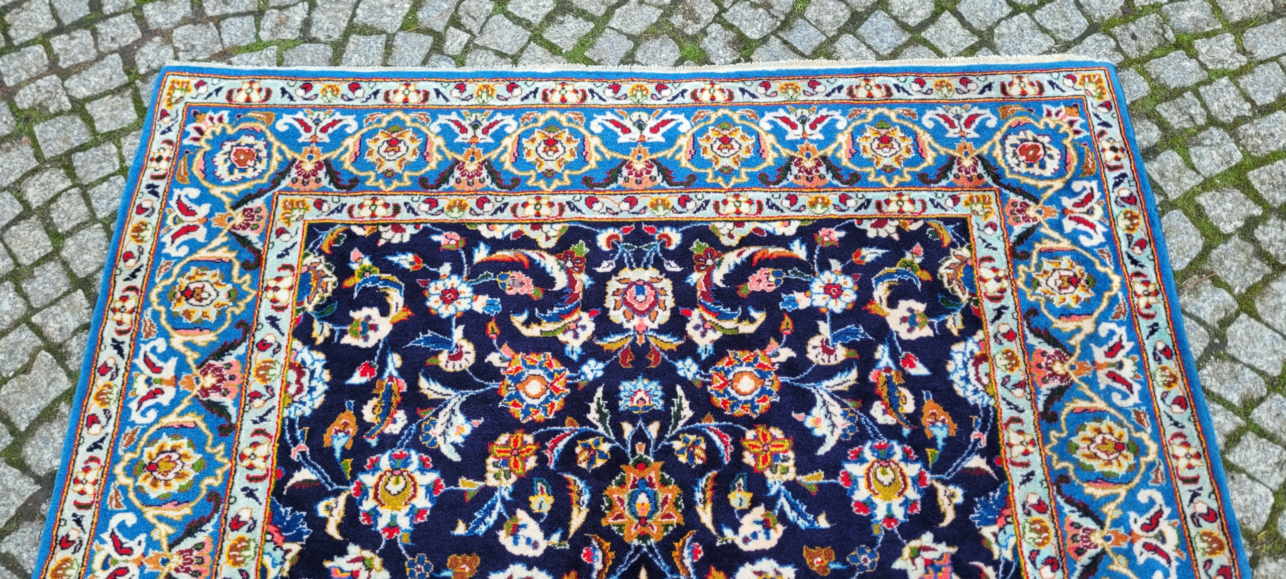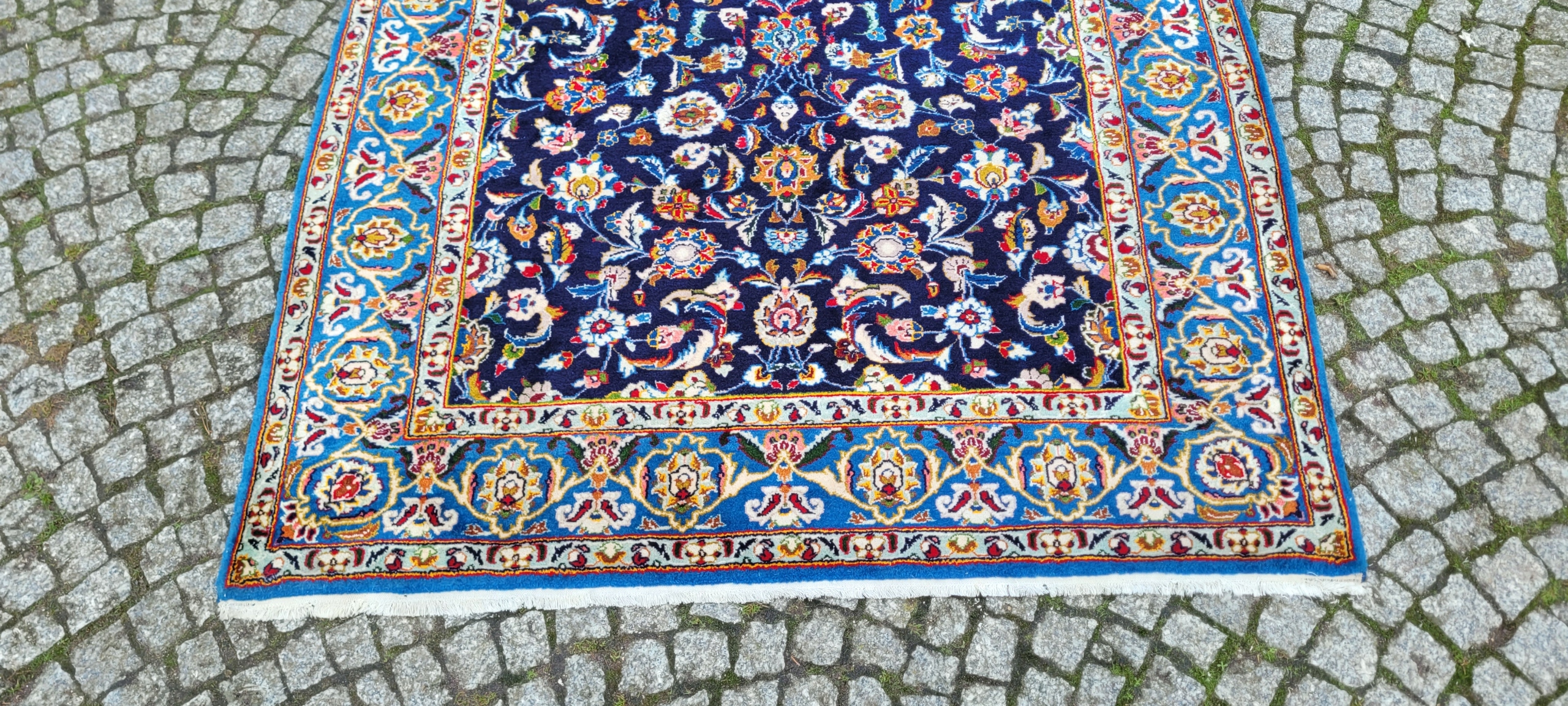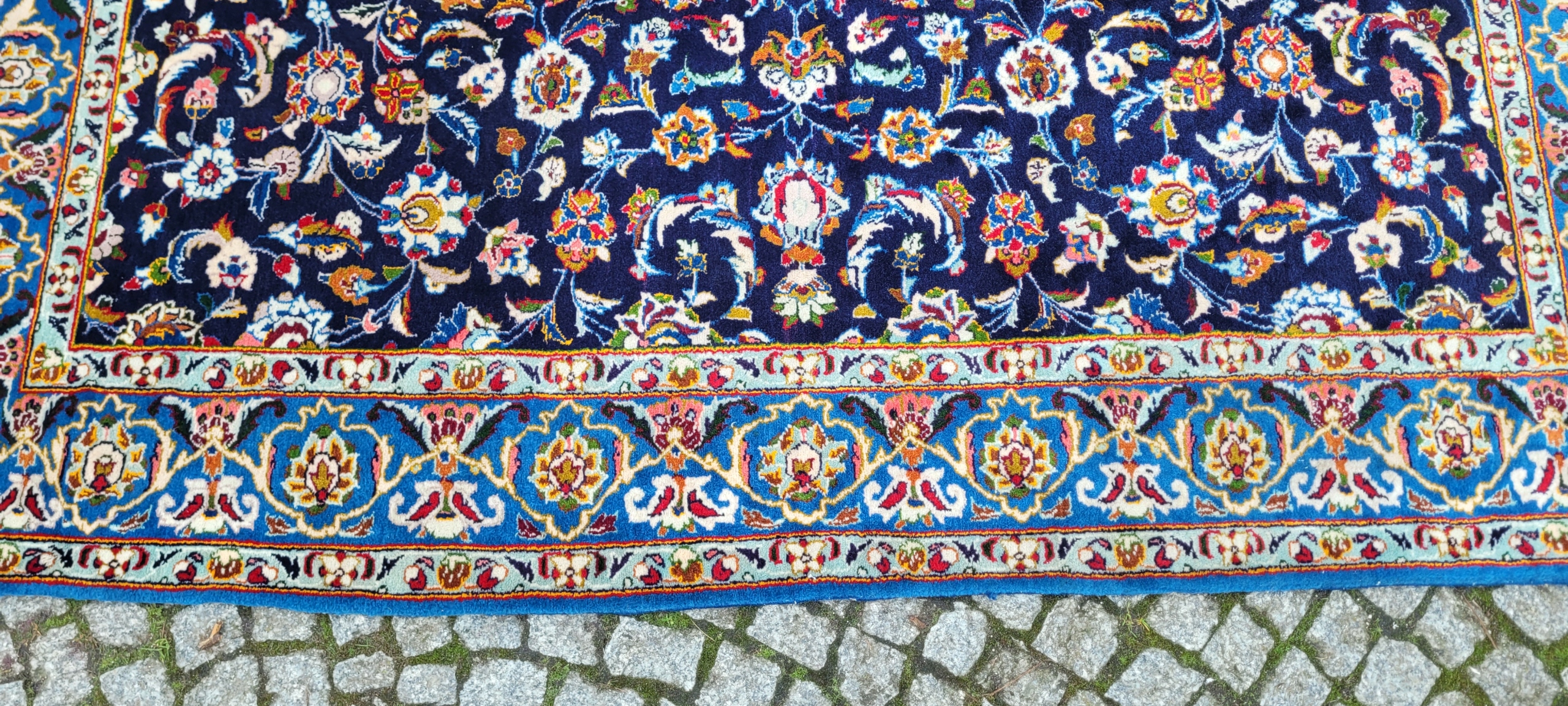 Перський кешанський килим. Виткана вручну з блискучої вовни найвищої якості. Характеризується компактним, приємним на дотик, блискучим флісом і красивими кольорами та візерунками. Килим в дуже хорошому стані, видно на фото.
